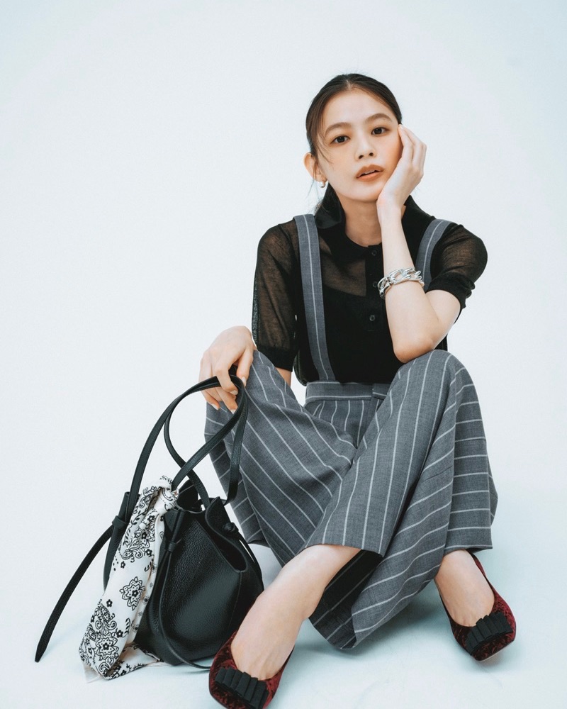 シアーポロニット¥6,990(Gap)タンクトップ¥6,500(バナナ・リパブリック)サスペンダーパンツ¥33,500(シーニュ)バッグ¥95,700〈ユゼフィ〉パンプス¥71,500〈ペリーコ〉(ともにアマン)スカーフ¥16,500(マニプリ)リボンバレッタ¥83,600(アレクサンドル ドゥ パリ/アレクサンドル ドゥパリ GINZA SIX店)ピアス¥6,820バングル¥14,300(ともにアビステ)