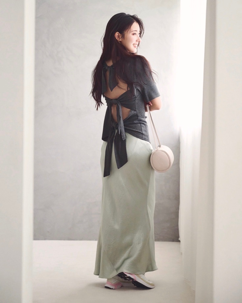 9月21日(日)、背中が大胆に開いたデザインにバックリボンが目を引くTシャツは、ヘルシーさと抜け感を両立し、甘くなりすぎず着回しやすいのが魅力。今年大人気のサテン風スカートは、光沢感があり上品さを演出。ミントグリーンの爽やかさに、白の小物を合わせて優しげな配色にまとめれば、大人の甘さを楽しめるスタイルに。
