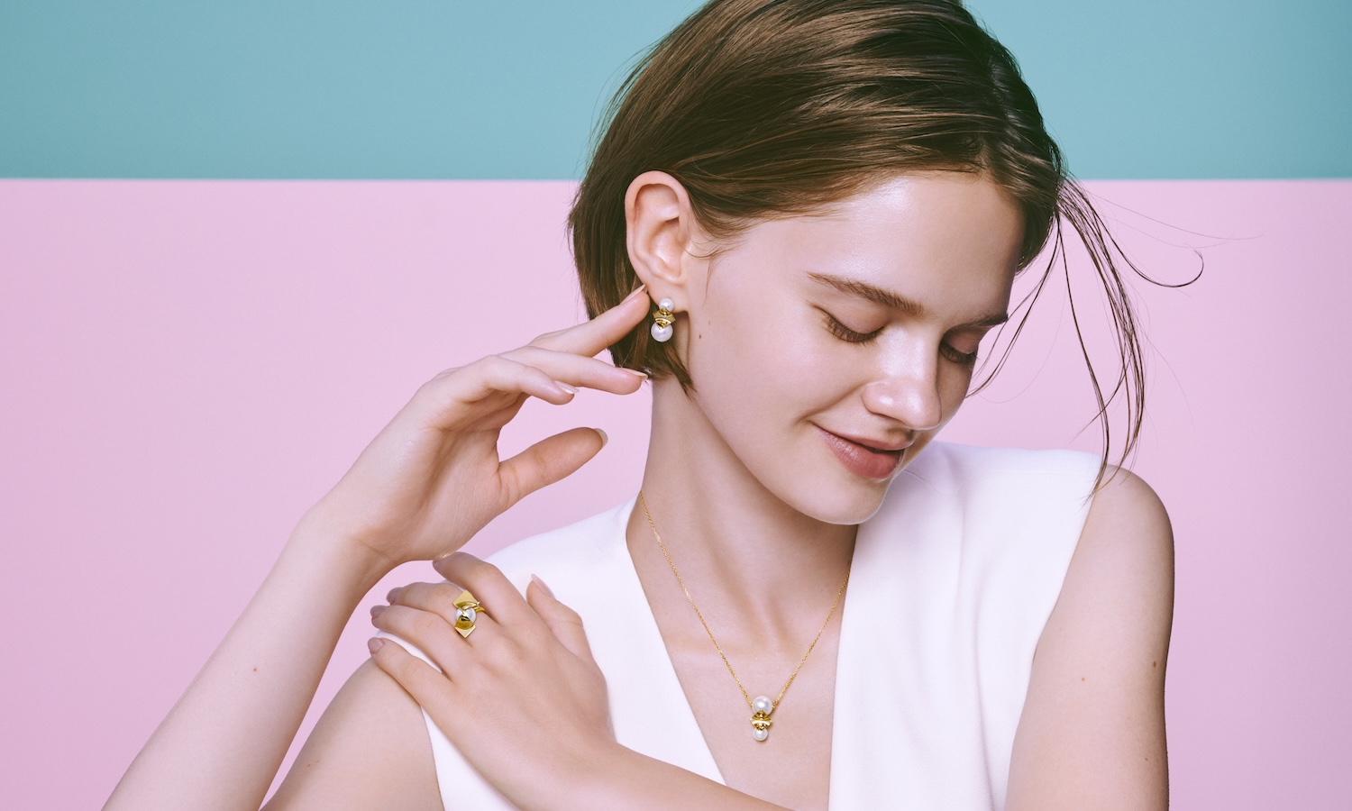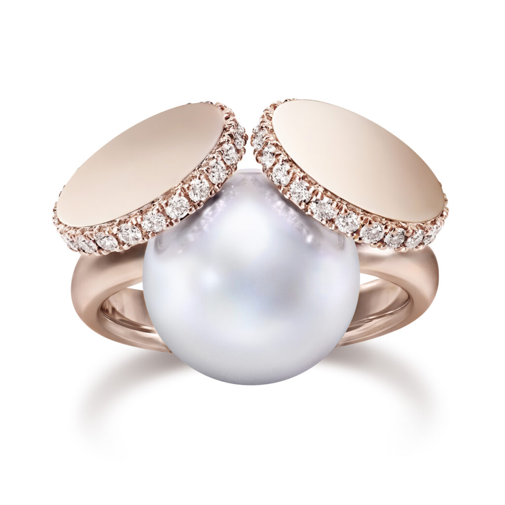 ディスクパール ペンダント〈K18 SAKURAGOLD(TM)×南洋真珠 白蝶×D〉¥1,210,000、ディスクパール イヤリング〈K18 SAKURAGOLD(TM)×南洋真珠 白蝶×D〉¥1,540,000、ディスクパール リング〈K18 SAKURAGOLD(TM)×南洋真珠 白蝶×D〉¥1,650,000