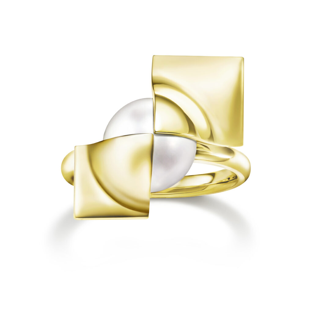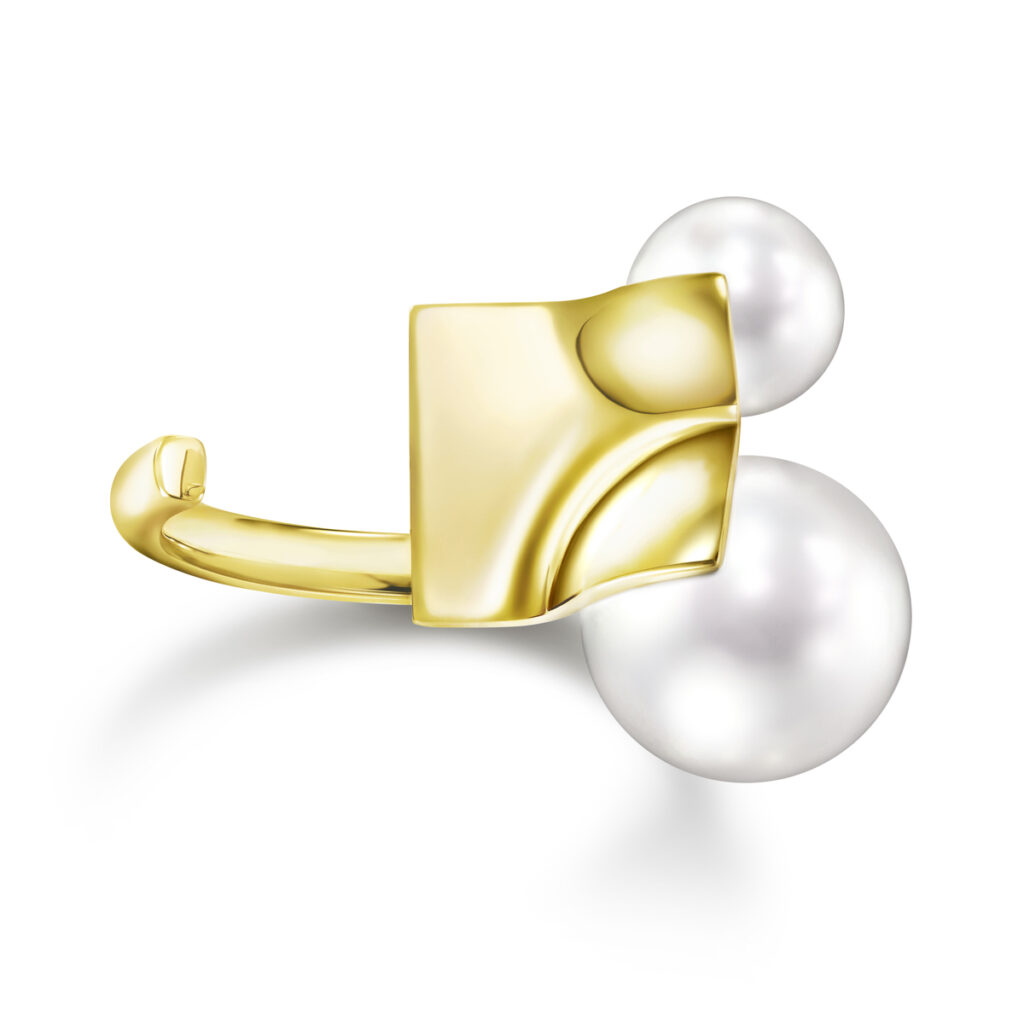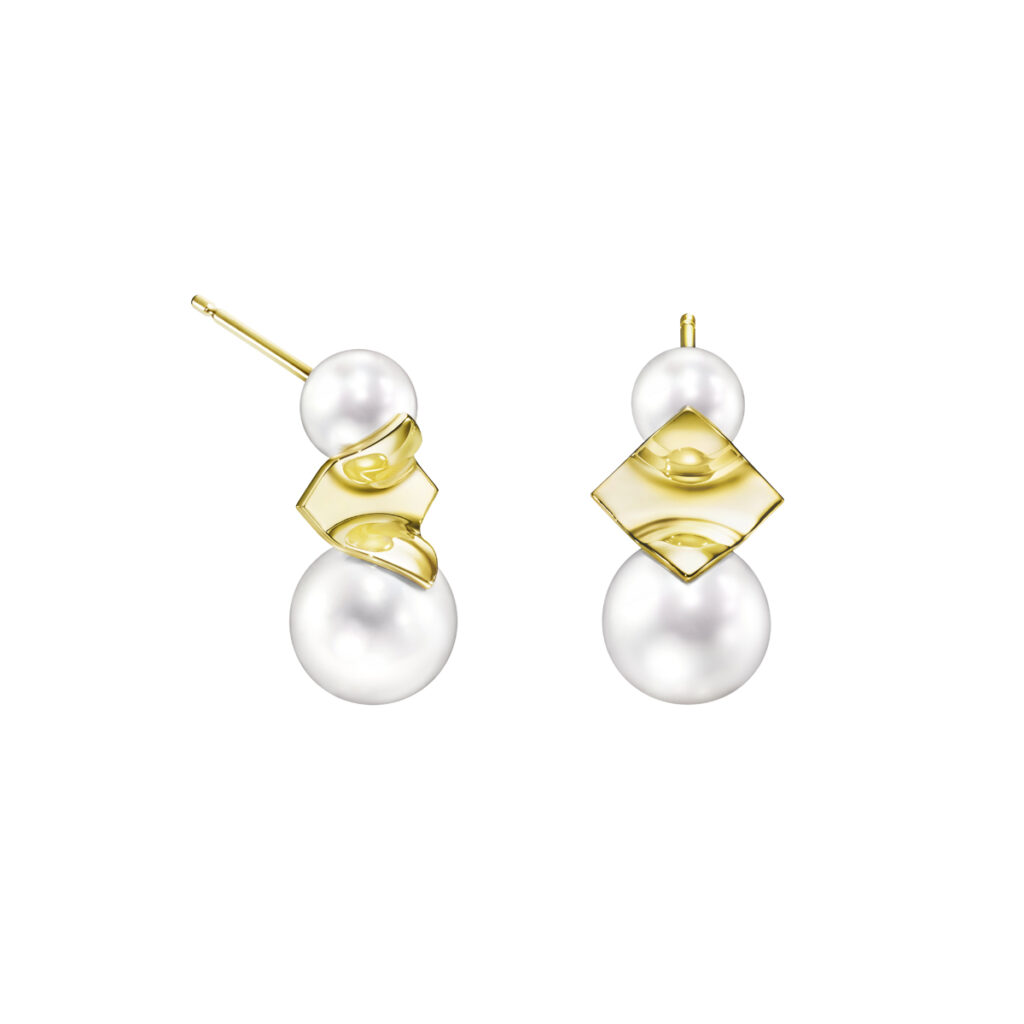 そして「エム/ジー タサキ」からは、サイズの異なるパールと葉のようにしなやかさのあるゴールドを幾何学的に組み合わせ、エッジさと柔らかな曲線をリズミカルに表現した「SQUARE LEAF(スクエアリーフ)」シリーズと、浮遊感のあるディスクとパールのシルエットがユニークな、遊び心たっぷりの「DISC PEARL(ディスクパール)」シリーズが登場します。