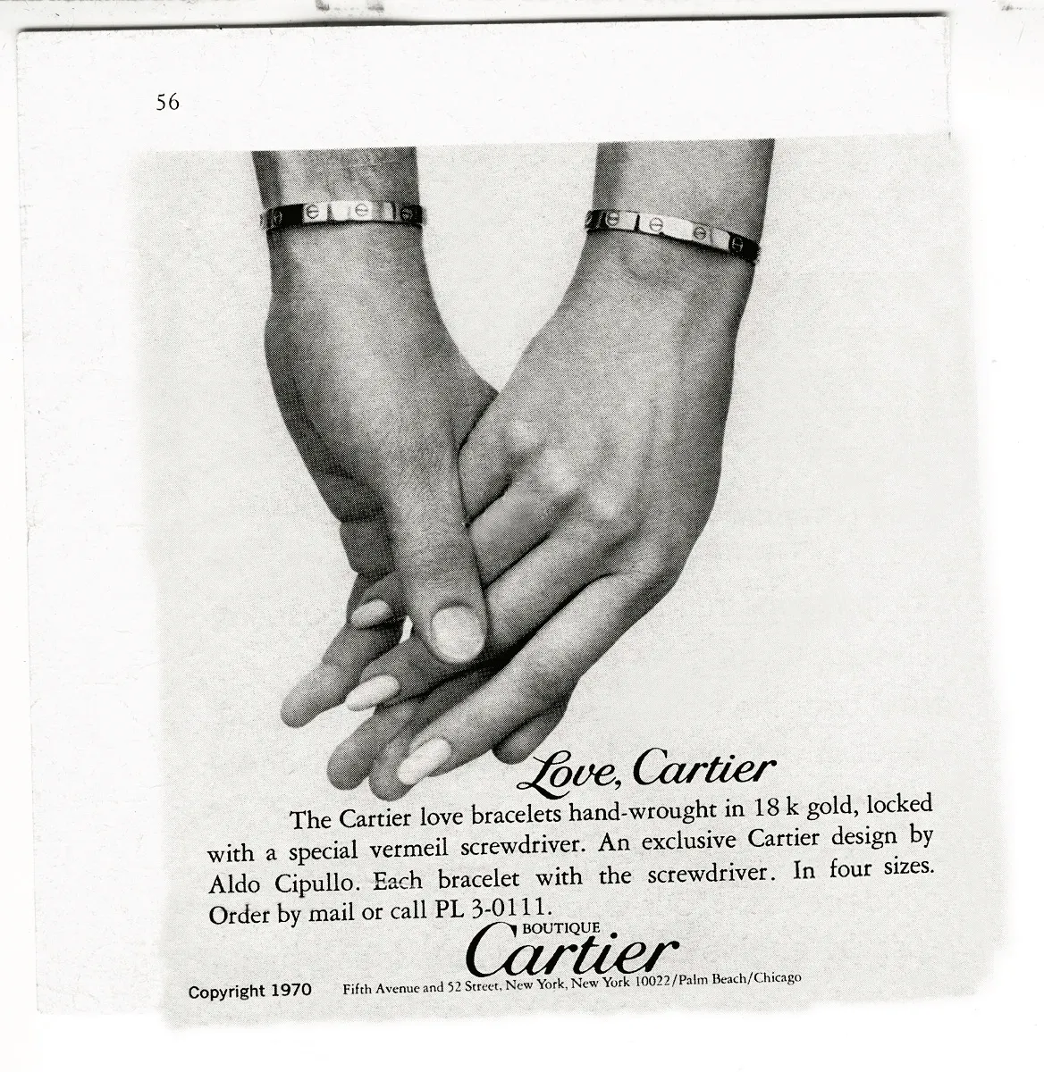 「LOVE」コレクションの物語は、1969年にイタリア出身のジュエリーデザイナー、アルド・チプロがカルティエ ニューヨークのために生み出した「LOVE」ブレスレットからスタートしました。 そのデザインはとてもユニークで、2つの半円をビスで留めて形作るオーバル型が特徴。専用のスクリュードライバーで着脱するという独創的な仕組みは、愛や絆をそこに“封じ込める”という象徴的な意味を持ち、当時から大きな話題を呼びました。