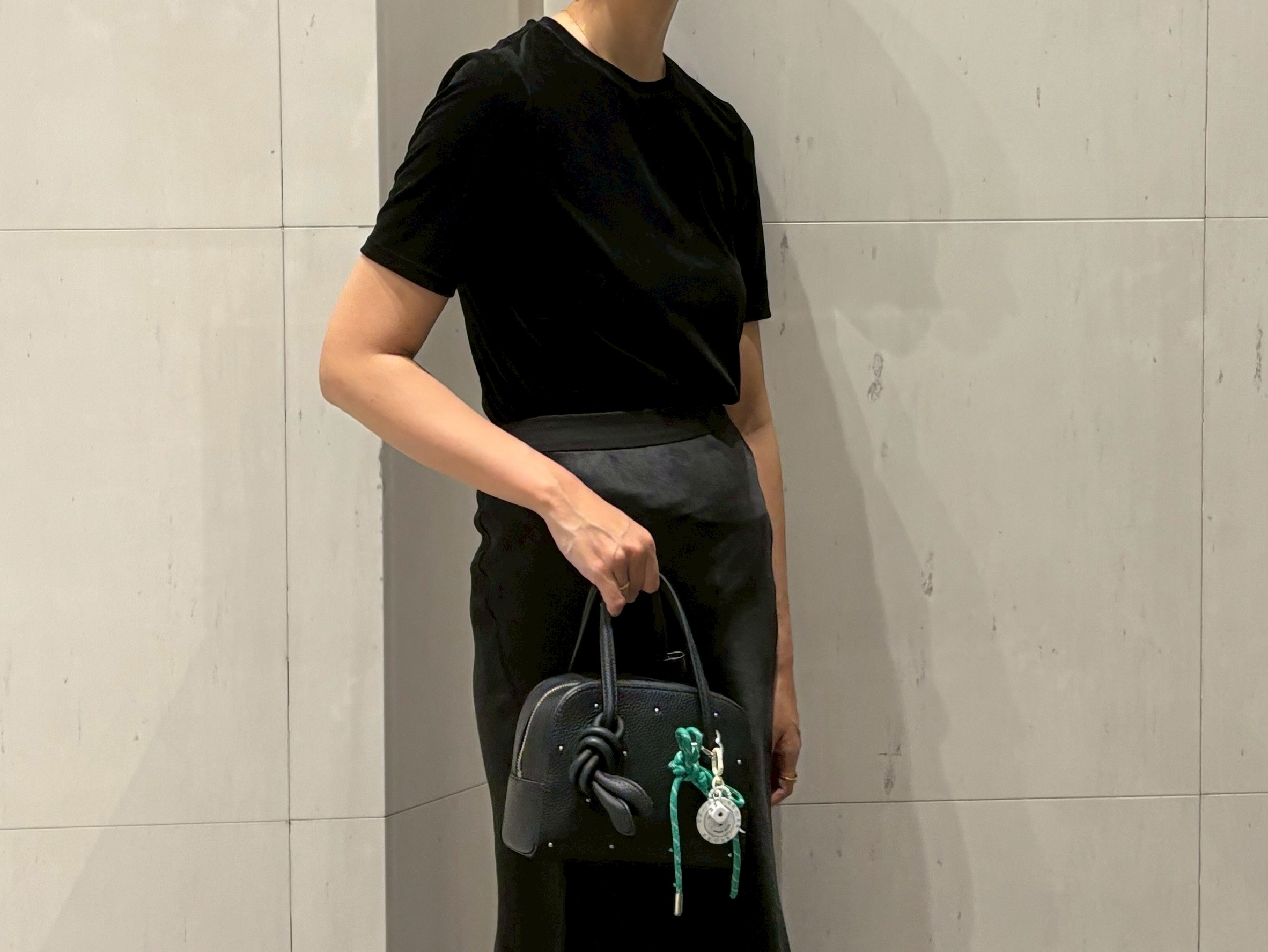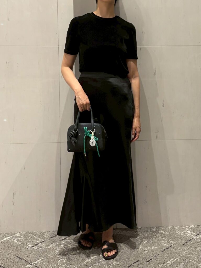 友人と百貨店で買い物→フレンチディナーという日にもマッチ。サテン仕上げのマーメイドスカートと合わせれば、一気にドレッシーなオールブラックコーデに。異素材ミックスで奥行きが出るのもポイント。スタッズつきミニバッグを加えて「光る黒」スタイリングを楽しみました。