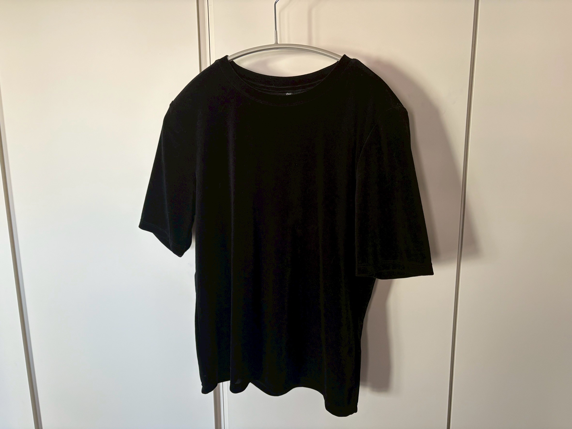 CLASSY.誌面の人気企画「CLASSY.スタッフの最近、何買った?」が、オンライン限定の不定期連載としてパワーアップ! CLASSY.の編集スタッフが最近買った“お気に入り”を思い入れたっぷりに語ります。今回の購入品は、GUで見つけたベロア素材の黒Tシャツ。お値段なんと¥1,290、今はセールで¥790という破格の一枚をゲットしました!