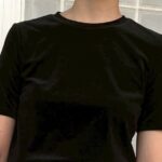 首元はつまり気味、袖は5分丈のベーシックなデザイン。身長171㎝で普段TシャツではLを選ぶことが多いのですが、今回はサイズ違いを試着してMに決定。やや身幅に余裕があるのと、体のラインを出したくて、いつもより小さめにしました。黒の引き締め効果もあり、自然に“痩せ見え”している気がします。