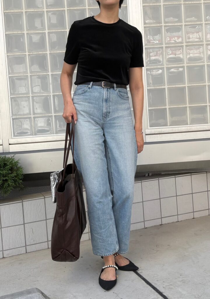 こちらはとある日の通勤コーデ。暑い日のワンツーコーデも、このベロアTのおかげでニュアンスがプラス。シンプルなTシャツ+デニムが、一気に“トレンドを意識してる人”に見えます。黒小物でまとめると大きめのレザーバッグもラフになりすぎず、きちんと感が出せました。