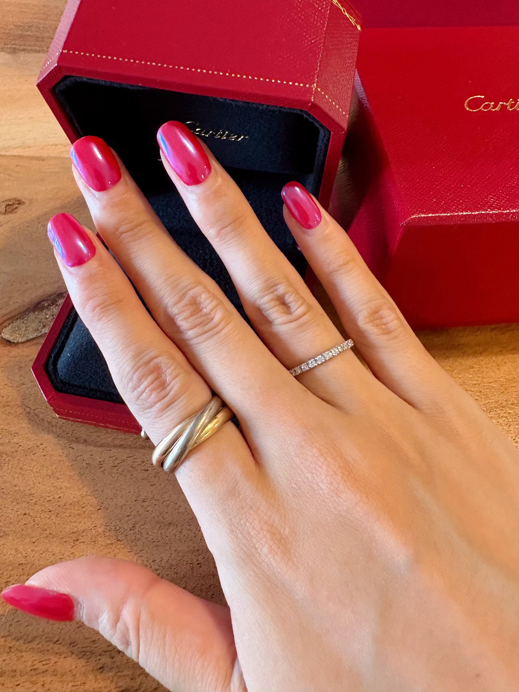 トリニティは3色使いなので、色の違うジュエリーを着ける際に橋渡し役になってくれると聞いていましたが、まさにその通りで、使い勝手抜群。また他のリングとの組み合わせによって、手元の雰囲気がガラッと変わるので、ダイヤのエタニティと合わせたり、パールリングと合わせたりと、ジュエリーコーデの幅がグンと広がりました。