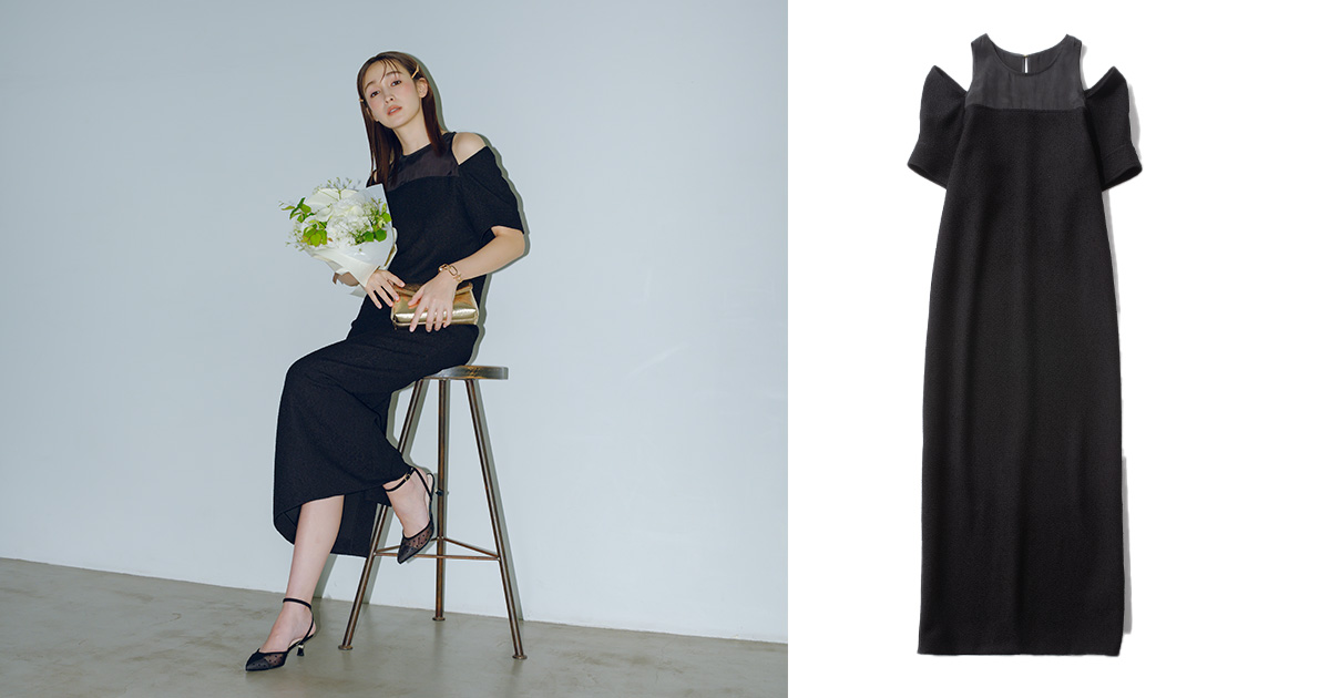 春夏に適した薄手のツイードで、柔らかく軽い着心地。ポコポコとした立体的な素材は、座ったり動いたりしてもシワが目立ちにくいのが長時間の外出に嬉しいポイント。ブラックでも肩先のスリットや胸元にドッキングされた透け感素材のおかげで、重くならずに着られます。ワンピース¥25,300(ノーブル/ノーブル 有楽町マルイ店)