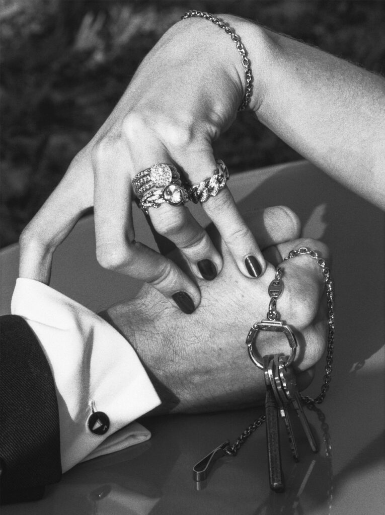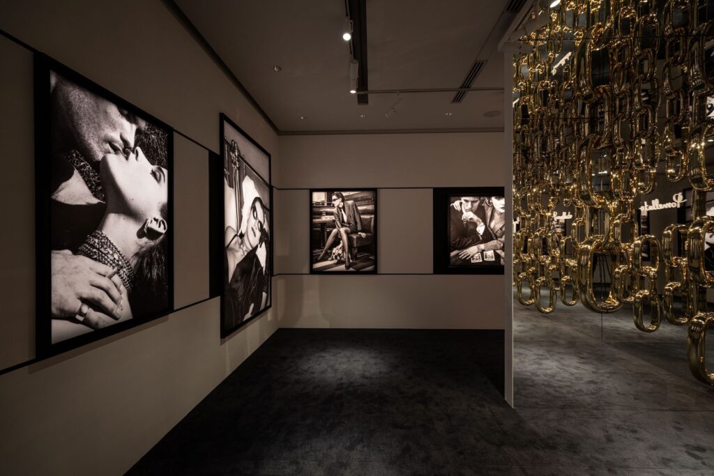 ポメラートは、1980年代にいち早く、従来のラグジュアリー広告から脱却し、著名なファッションフォトグラファーとのコラボレーションを取り入れた最初のジュエリーメゾン。本展では、ヘルムート・ニュートンが1982年から1984年にかけて手がけた革新的なポメラートキャンペーンが、ラージフォーマットのプリントとして初めて展示されています。これらのモノクロ作品は、当時の著名誌に全面広告として掲載され、従来の広告手法を根底から覆す革新的なコンセプトで、かなり話題となったそう。バーで寛ぐサングラスをかけた女性の手首には1本のブレスレット、テーブルにこぼれ落ちるようにネックレスが広がる演出や、手首を飾る複数のブレスレットのクローズアップなど、クールでスタイリッシュなビジュアルが展開。彼のレンズが捉えたのは、単なる装飾品や他者から与えられたステータスシンボルとしてのジュエリーではなく、女性の自立の表明であり、自分のためにジュエリーをまとう主人公の姿でした。