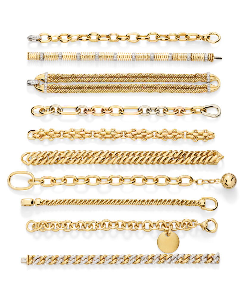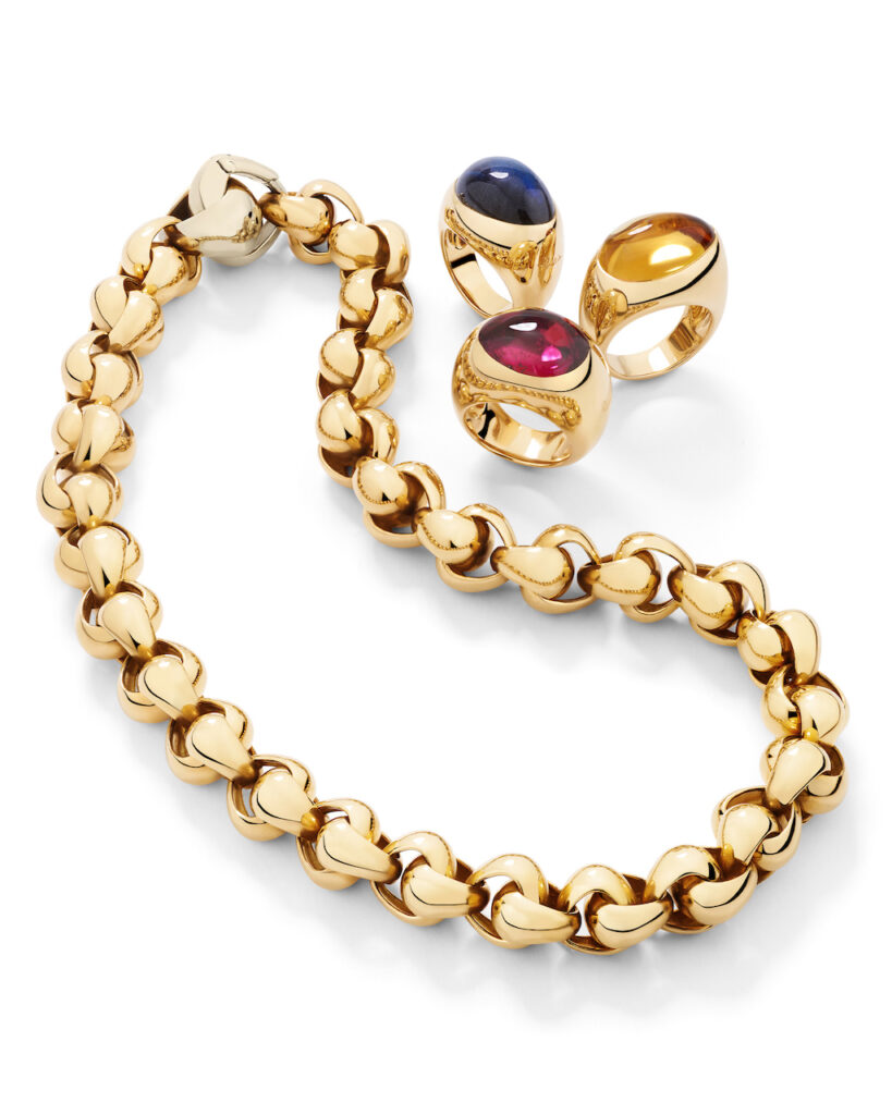 自然なカーブを描く名作グルメチェーン、イエローゴールドとダイヤモンドによる建築的な「Gate-link」 ネックレス、そして上質な織物のようにしなやかな「Tessute」のマスターピースなど、かつてのポメラートの魅力溢れる作品作りが垣間見られるとても見応えのあるラインナップに。(取材担当のジュエリーライター沼田は、自身がファーストポメラートとして手に入れたリングと同デザインのリングが展示されていて感動!)