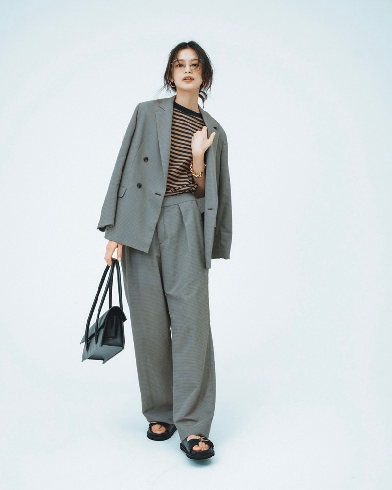 ジャケット¥26,400ボーダーTシャツ¥5,390パンツ¥14,300(すべてスーツセレクト恵比寿店)バッグ¥44,000(モフィオラ/アマン)サンダル¥29,150(カミナンド/グラビテート)ピアス¥9,240ブレスレット¥18,900(ともにアビステ)メガネ¥41,800(ワンスリー コンパウンド フレーム/デュアル)