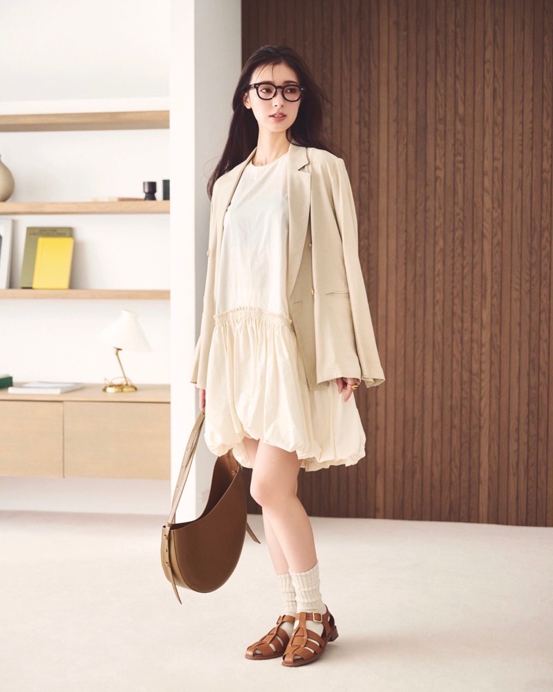 9月26日(金)、白のバルーンシルエットのミニワンピースは、ガーリーな甘さ全開のアイテム。そこにベージュのジャケットを羽織れば、甘さを引き算しつつ、きちんと感をプラスできます。足元はグルカサンダル×ソックスで肌見せを程よく調整。仕上げにメガネを効かせれば、知的なニュアンスが加わり、甘辛バランスが絶妙な大人ガーリースタイルに。