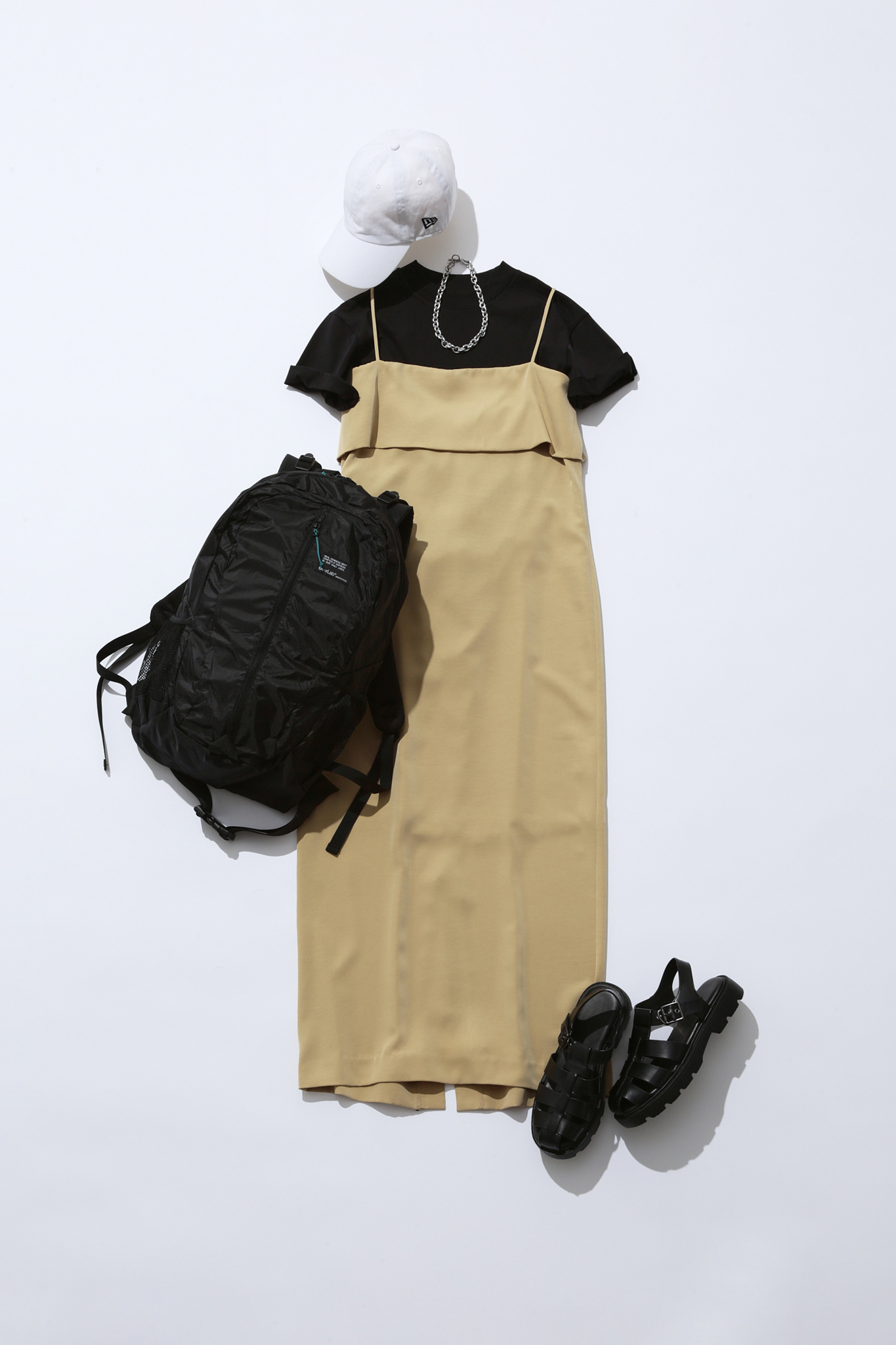 フェミニンなワンピースにキャップやリュック、グルカサンダルといったアクティブなアイテムを合わせることでトレンドのスポーティMIXコーデに。ロングワンピのインは黒Tシャツの袖をまくってコンパクトに見せると、背が低い人でもバランスよく仕上がります。
