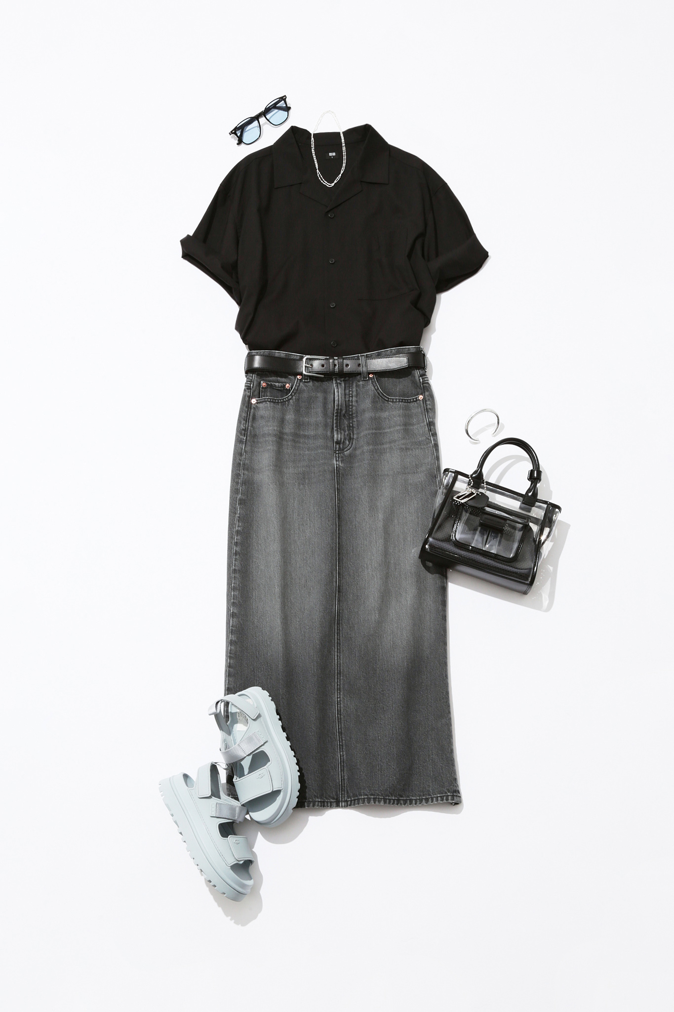 ゆるっとメンズライクなオープンカラーシャツにスカートを合わせることで、ボーイッシュになりすぎずに女性らしさも忘れないコーデが完成。クリアなバッグやサングラス、シルバーアクセでこなれ感を演出すると洒落感アップ。