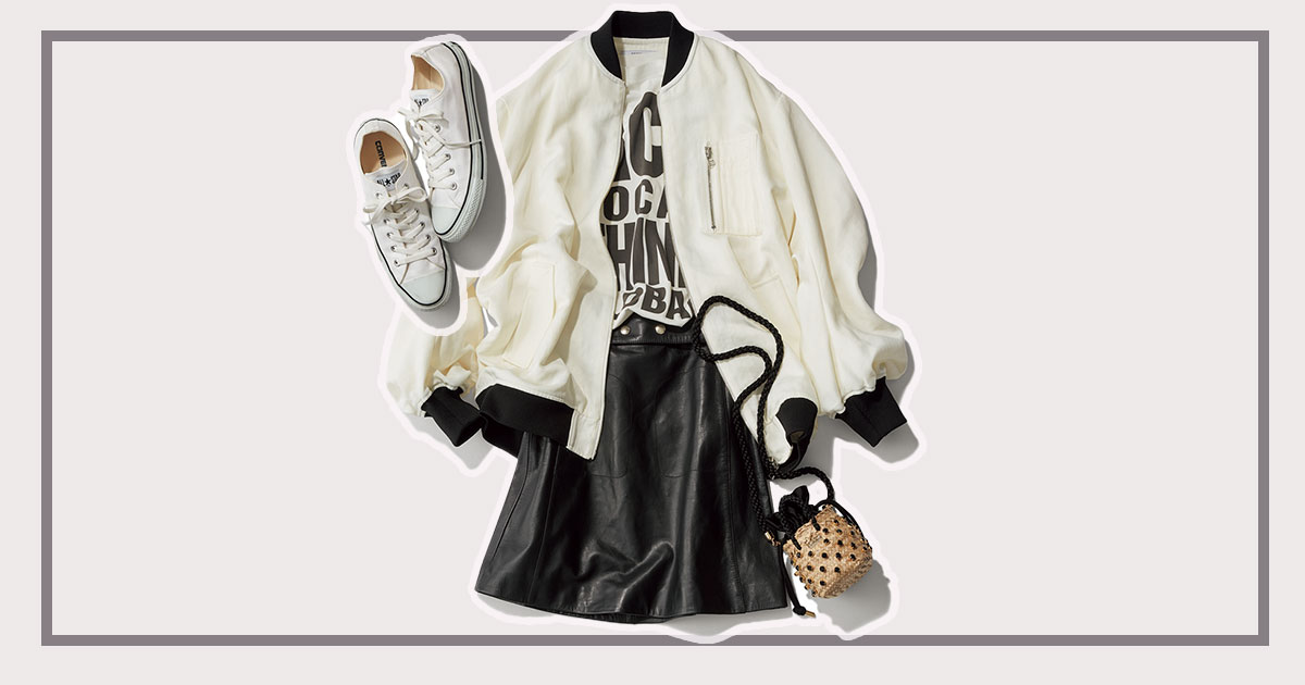 ローテクスニーカーでコンパクトにまとめるのが旬なスタイル。ブルゾン¥52,800(ダブルスタンダードクロージング/フィルム)ロゴTシャツ※別注¥15,400(THIRD MAGAZINE×KATHARINE HAMNETT/THIRD MAGAZINE)スカート¥107,800(アルマ/エストネーション)バッグ¥71,500(LE NINE/ピモンテ)スニーカー¥14,850(コンバース/コンバースインフォメーションセンター)