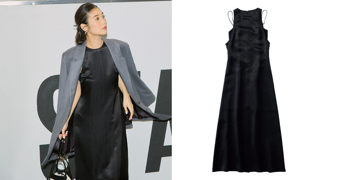 モノトーンコーデに艶を加えるサテン素材で華やかに。ビジネスシーンでも気後れしない長すぎず短すぎずなレングスやシェイプの利いたシルエットで、ジャケットを羽織ってももたつかない美ラインが絶妙。ワンピース¥24,200(ánuans)ジャケット¥64,900(イウエンマトフ/ユナイテッドアローズ 渋谷スクランブルスクエア店)バッグ¥42,900〈オルセット〉靴¥16,500〈MENBUR〉(ともにピモンテ)ピアス¥3,900(soie/ロードス)
