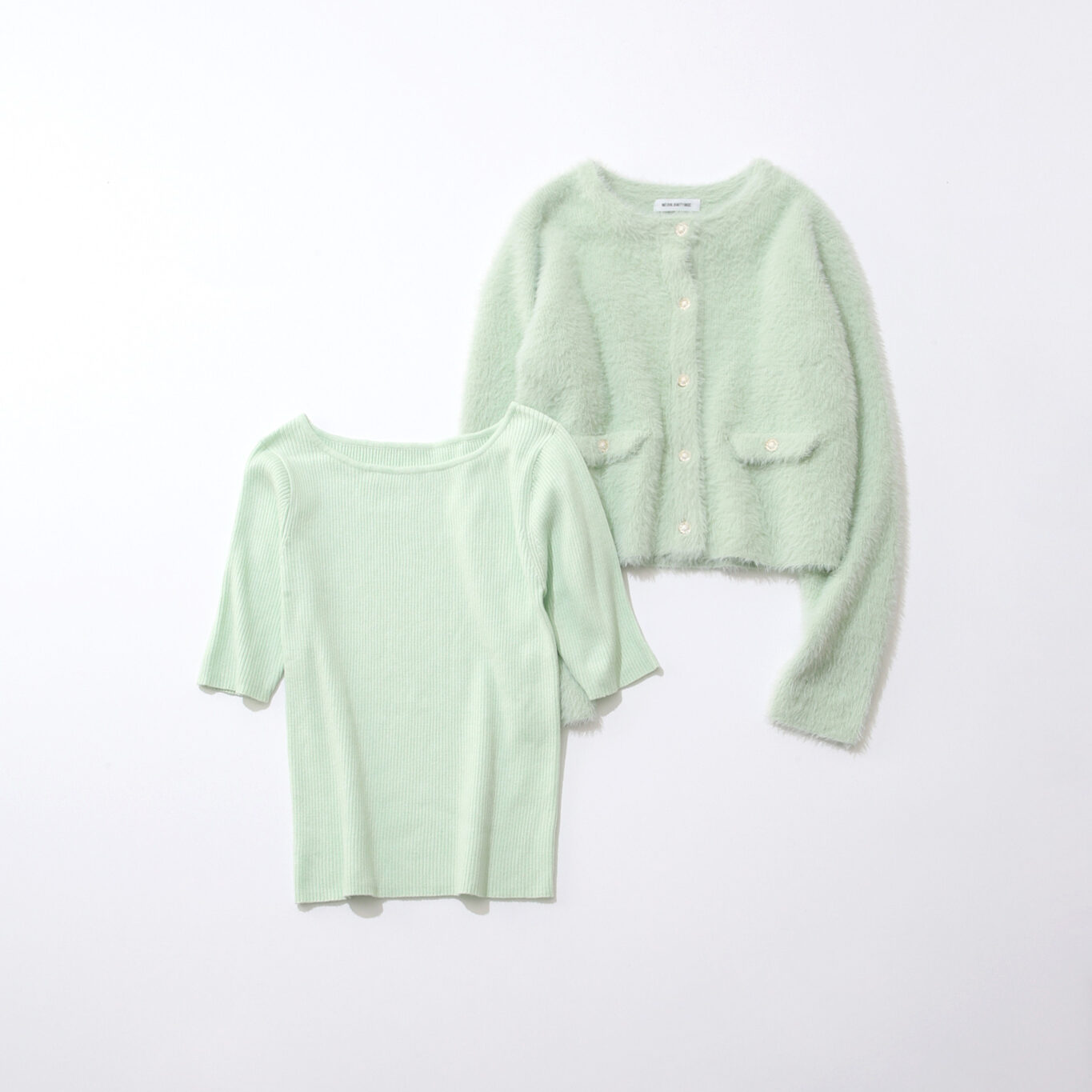 毛足のあるフワフワなシャギーカーディガンとすっきりとしたリブ編みタンクトップのアンサンブル。カーディガンの前を開けると、見えるデコルテがヘルシー。素材が異なるため、ボトムスや着こなしによって様々なスタイリングを楽しめます。シャギーニットアンサンブル¥12,991(NATURAL BEAUTY BASIC)