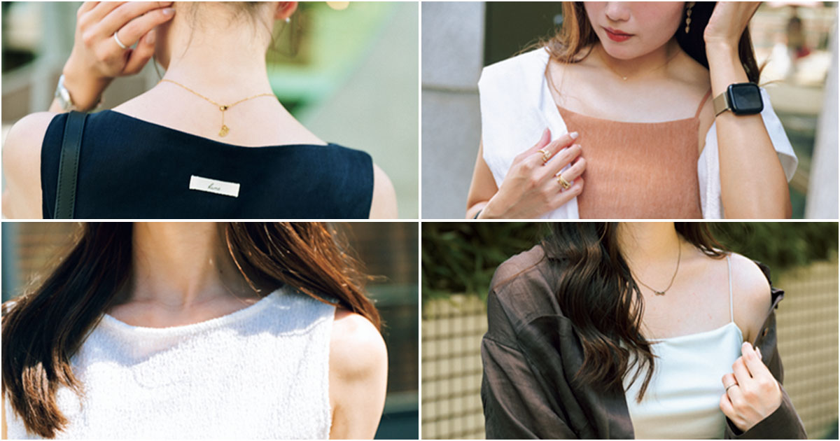 いつも涼しそうにオシャレを楽しんでいる人はどんなトップスを選んでいる?トップス一枚で仕上げるワンツーコーデにはボートネック、一方キャミには軽めのシャツなど羽織りもセットで選ばれる結果に。ぜひ首周りの抜け感の参考にしてみて。