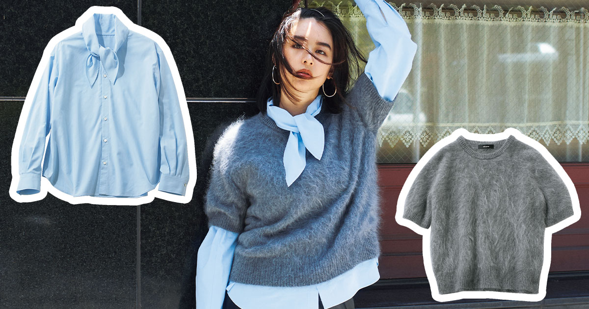 珍しいブルーのボウタイ衿のシャツは、甘すぎずちょうどいいバランスに仕上がります。程よい身幅で1枚で着ても完成度が高いです!