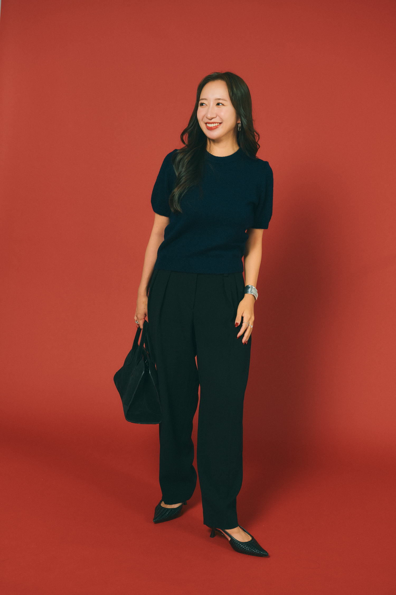 「半袖ニットは本格的に寒くなる前の短い時期しか着ないので、とにかくコスパが重要。上品なネイビーが高見えして、パフスリーブが可愛く1枚でもサマになります。Sサイズでも少しゆとりがあるので、メンズライクなパンツと合わせてバランスを調整。ほどよく厚みのある生地で身体のラインも出ず通勤にも安心して着られます」