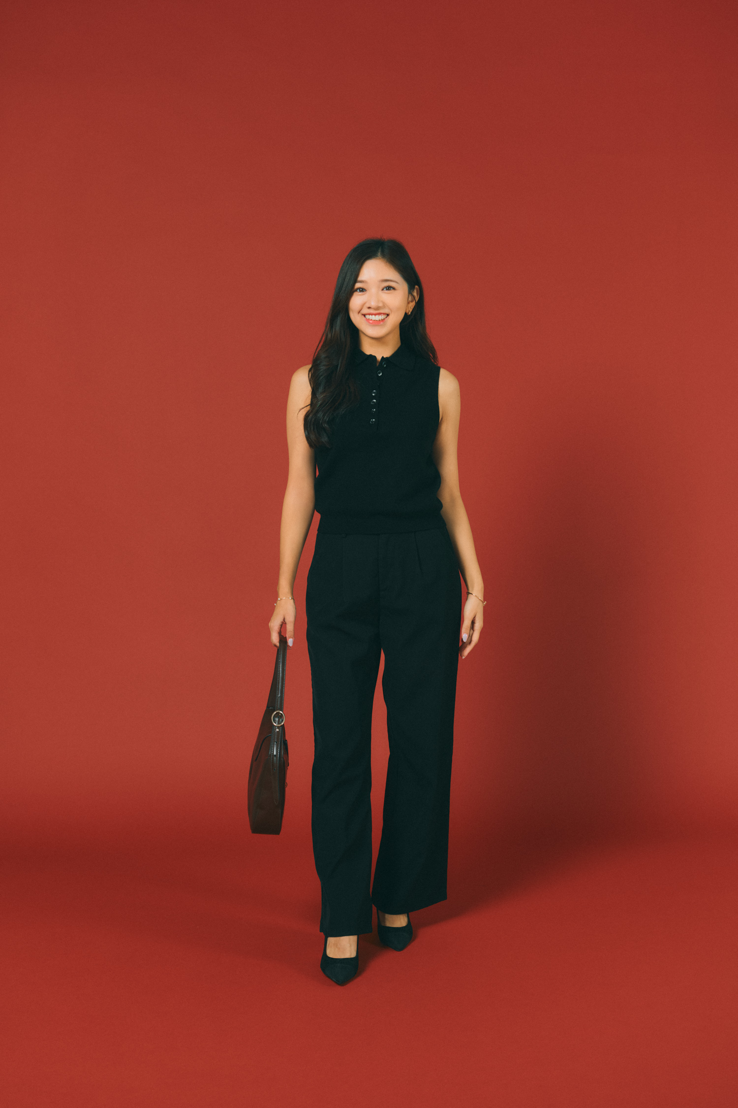 「きちんと見える黒のワントーンで、秋らしいオフィスコーデに。仕事の日は動きやすさ重視で、ヘビロテしているユニクロのパンツを合わせています。プチプラでも黒など暗めカラーのアイテムは高見えしてくれるのでつい選びがちです」