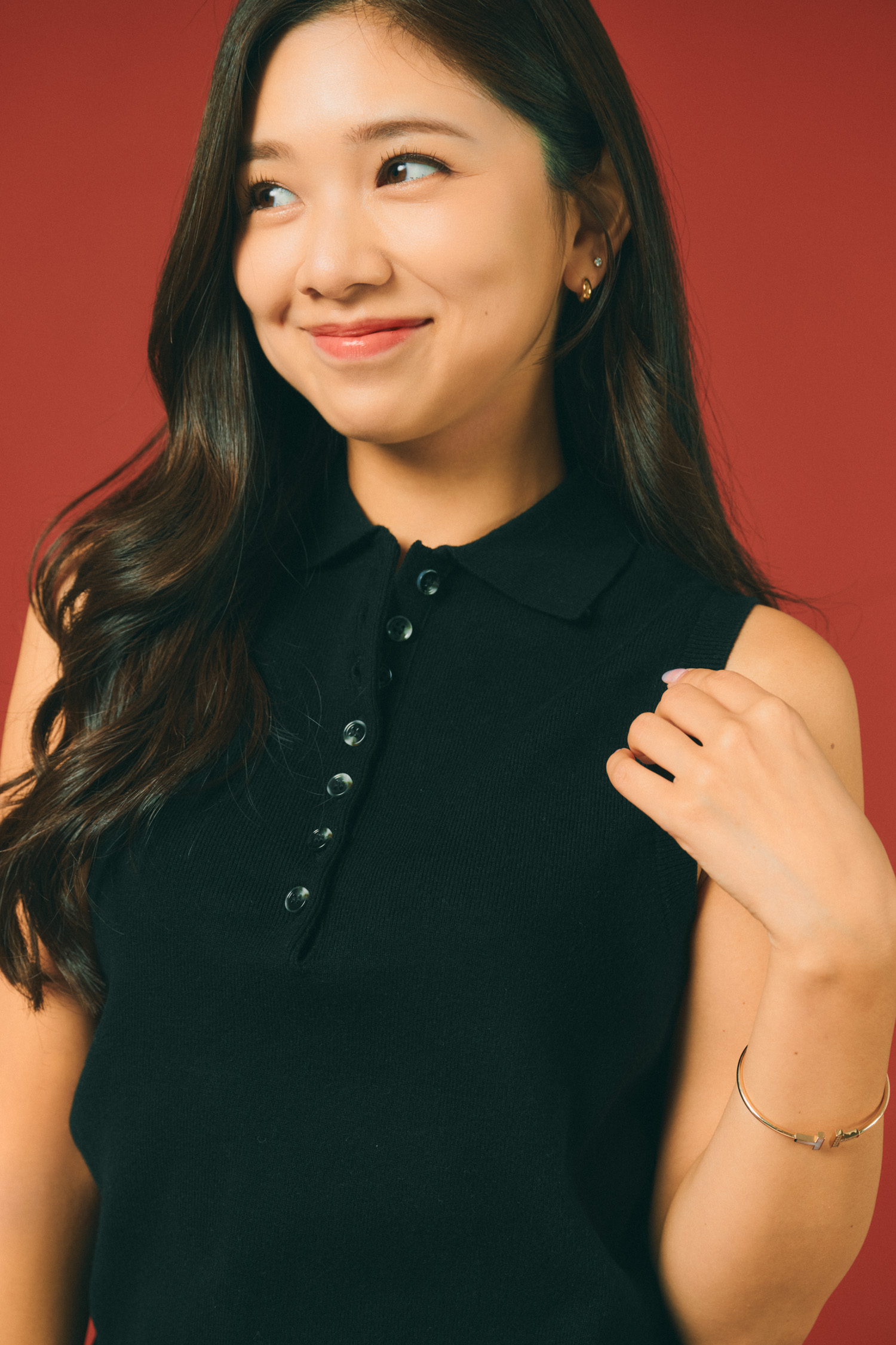 「先月購入したこのトップスは、襟付きのニット素材できちんと見えするのがお気に入り。フォーマル感があるので通勤にも使えるし、ジャケットを羽織ればクライアント対応もOK。休日はミニスカートを合わせると、女っぽい雰囲気になります。季節の変わり目にちょうどよくて、買って大正解でした!」