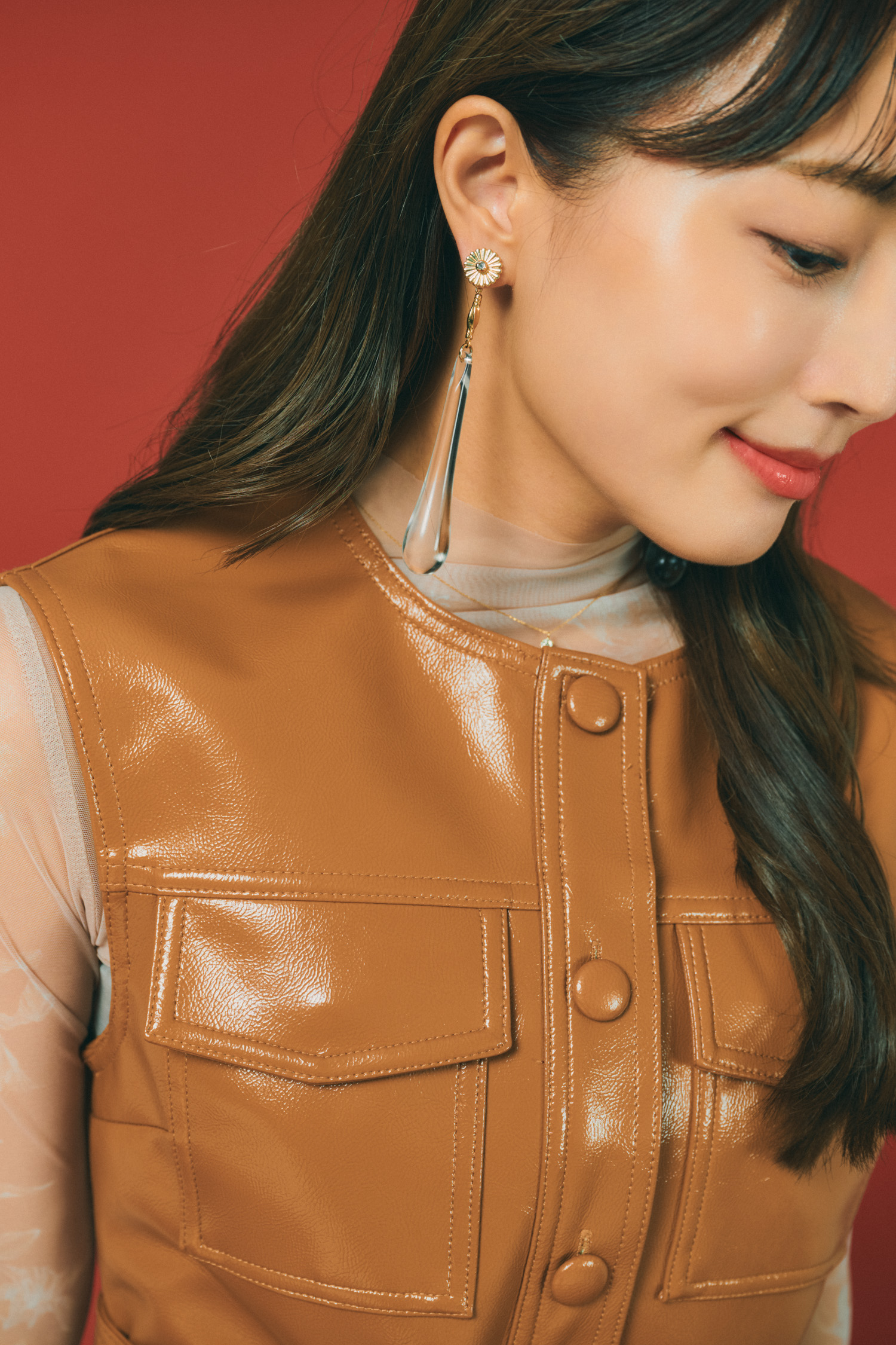 「今年らしい大人のミニ丈に挑戦したくて購入した、H&Mのフェイクレザーワンピース。コエルのメッシュブーツは黒ソックスを合わせることで、ショートブーツ風にアレンジ。足元が重くなりすぎないので、ミニ丈とも好相性です。ジョゼムーンのシアートップスをインナーに仕込んで、肌見せを控えめにしながらも清涼感をキープしました」