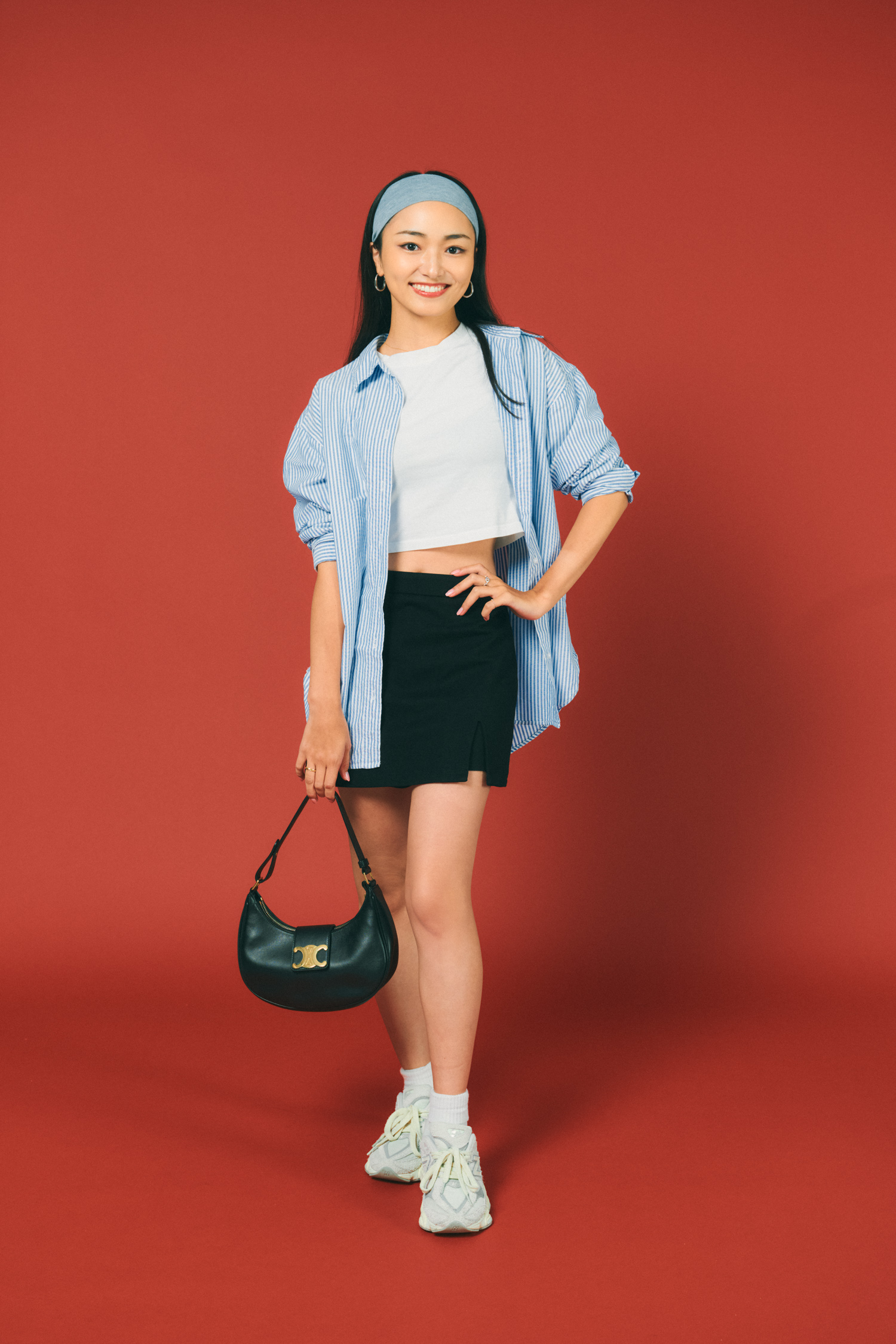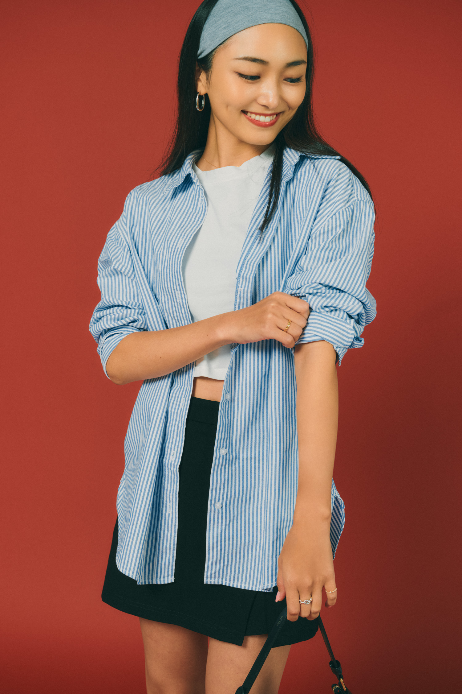 「トレンドのスポーティMIXは、この秋も継続したい気分です!ザラの短丈トップスにオックスフォードシャツを羽織って、肌見せ具合を調整。ヘアバンドやスニーカーで外すのが今年っぽさの秘訣。休日のジム後にそのまま友達とカフェにも行ける、抜け感のあるスタイルです」