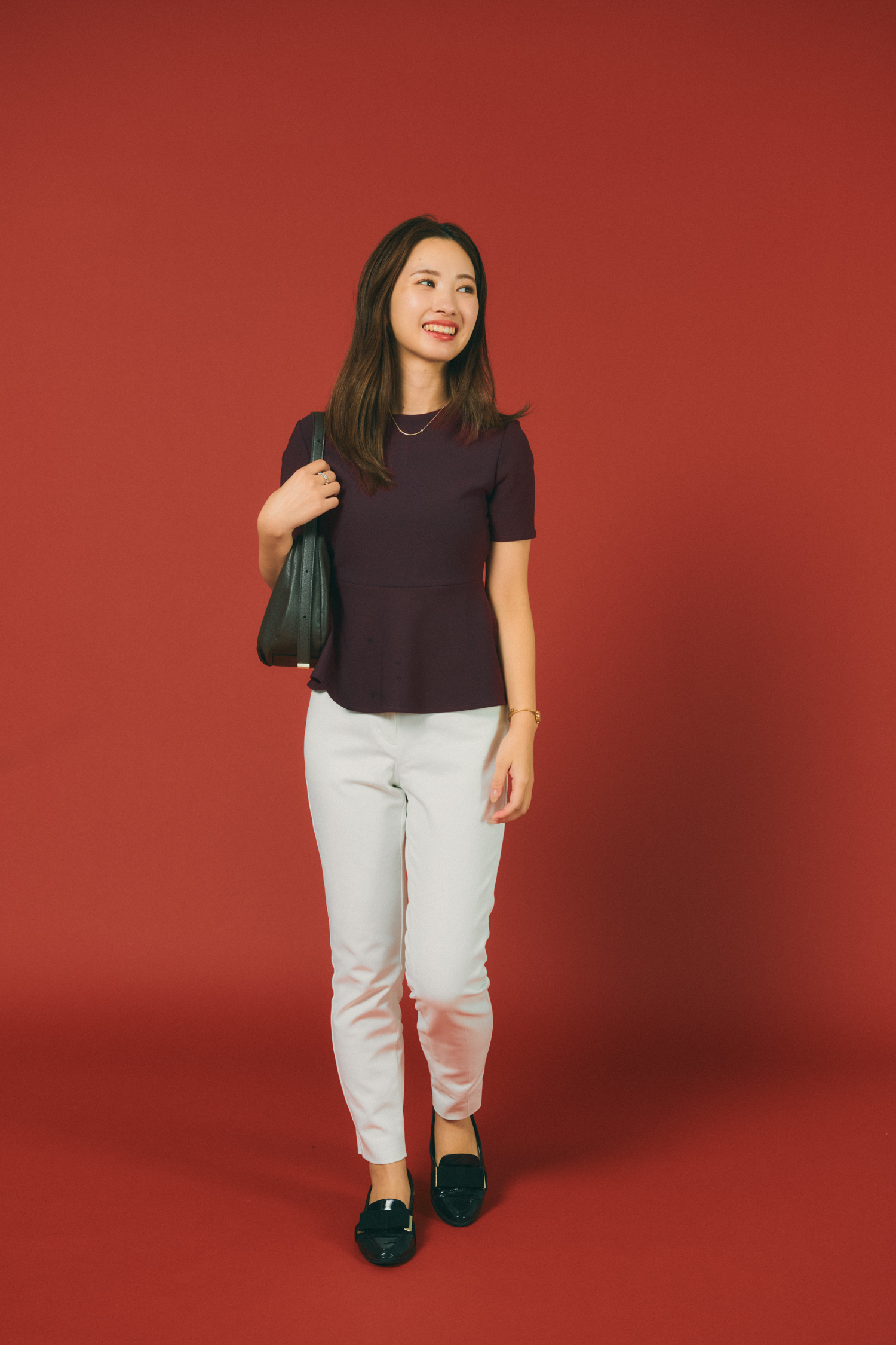 「暑がりなので、秋らしさを取り入れられるH&Mの半袖トップスが活躍中です。秋カラー・ボルドーのペプラムトップスをプラステのシンプルなスティックパンツに合わせました。きちんと感が出るのでお仕事シーンにピッタリです」