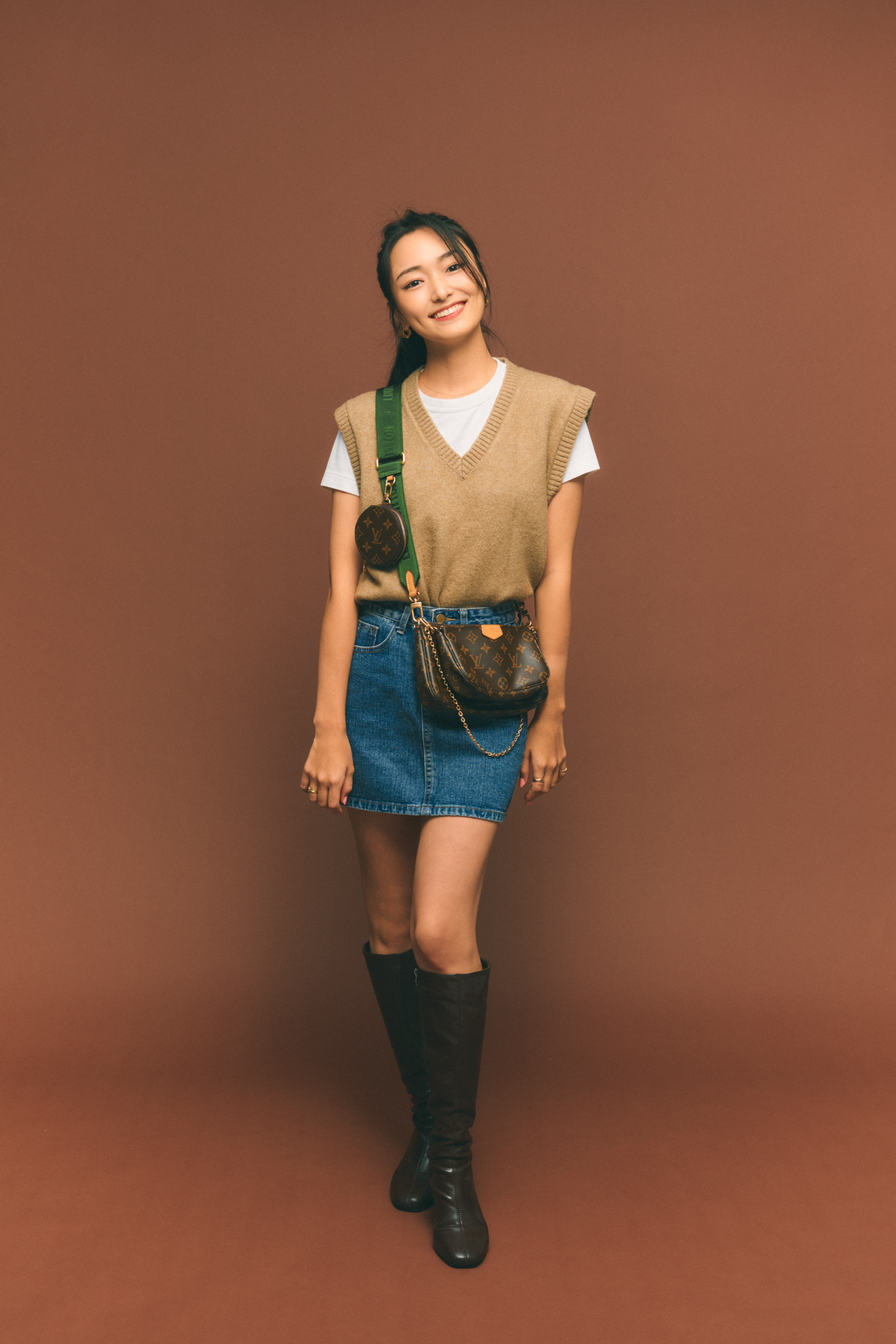 「やっと季節になったロングブーツに、今年トレンドのデニムのミニスカを合わせてみました。韓国ブランドのLUNEはお店も可愛くて、行くたびにチェックしちゃうブランド。ベストとTシャツを重ねて、大人っぽさを意識。レイヤードすることでシンプルコーデにこなれ感が出ます」
