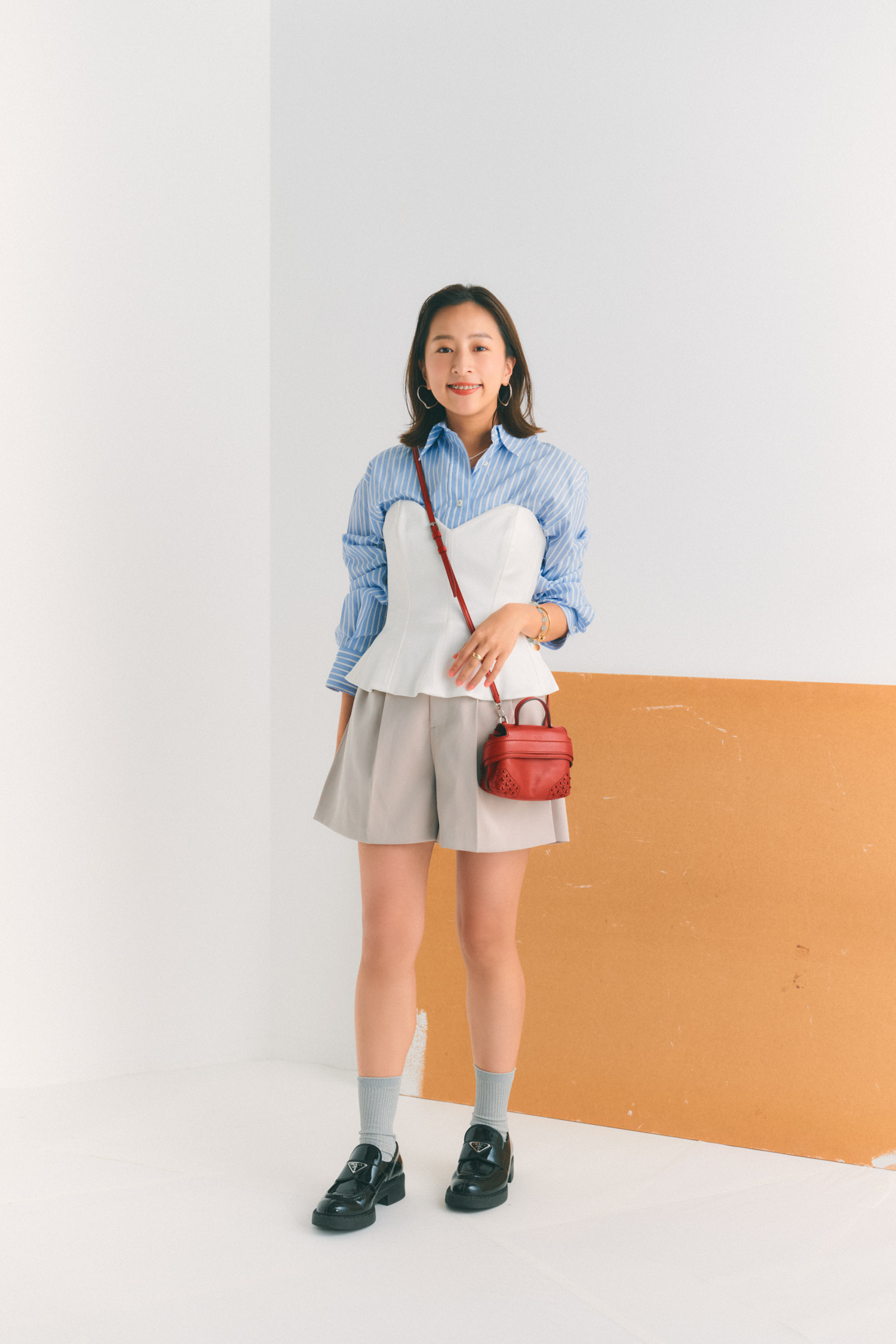「大好きなシャツは1枚で着るとコーデがマンネリになりがちなので、最近はレイヤードで遊ぶことが多いです。上半身にボリュームが出る分、フレイアイディーのミニボトムで肌見せして抜け感を出すように。トッズの赤バッグを差し色にしてメリハリをつけるのがポイントです」