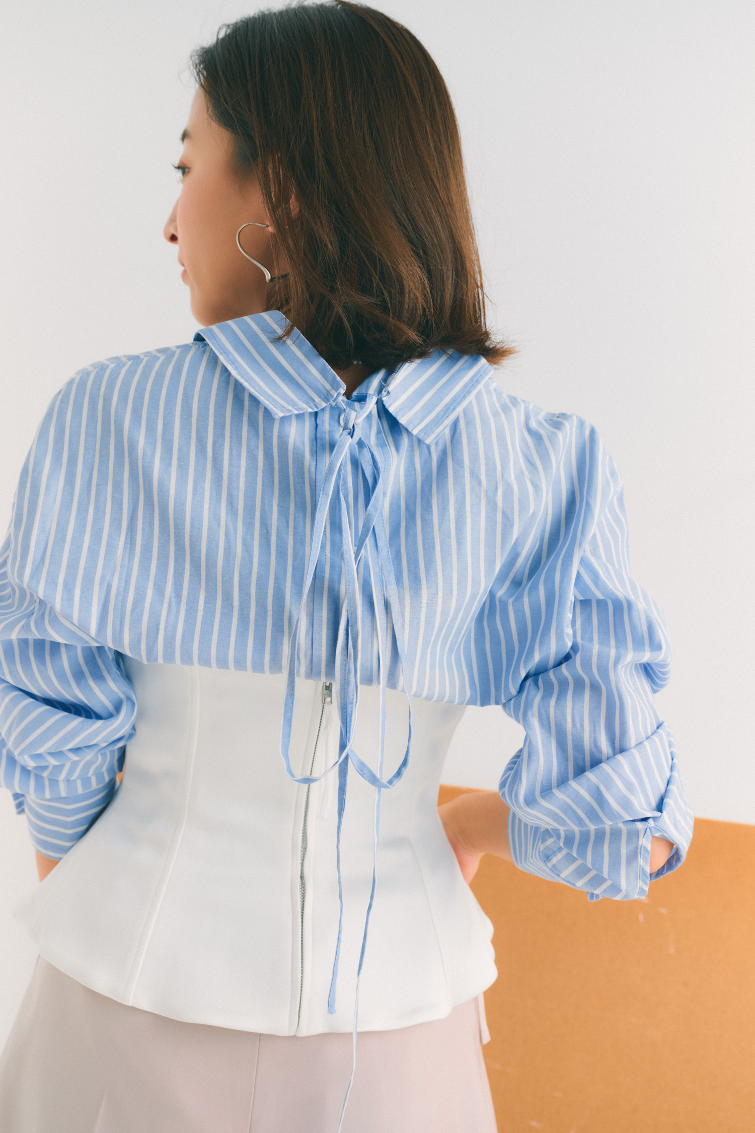 「ザラのシャツは後ろのリボンが可愛くてお気に入り。レイヤードしていても、ほどよく洒落感を足してくれます。バンクーバーのカジュアルブランド・アリツィアのビスチェは、去年ハワイのアラモアナで見つけて即購入。フィット感がちょうどよく、レイヤードしやすいのが嬉しいです」