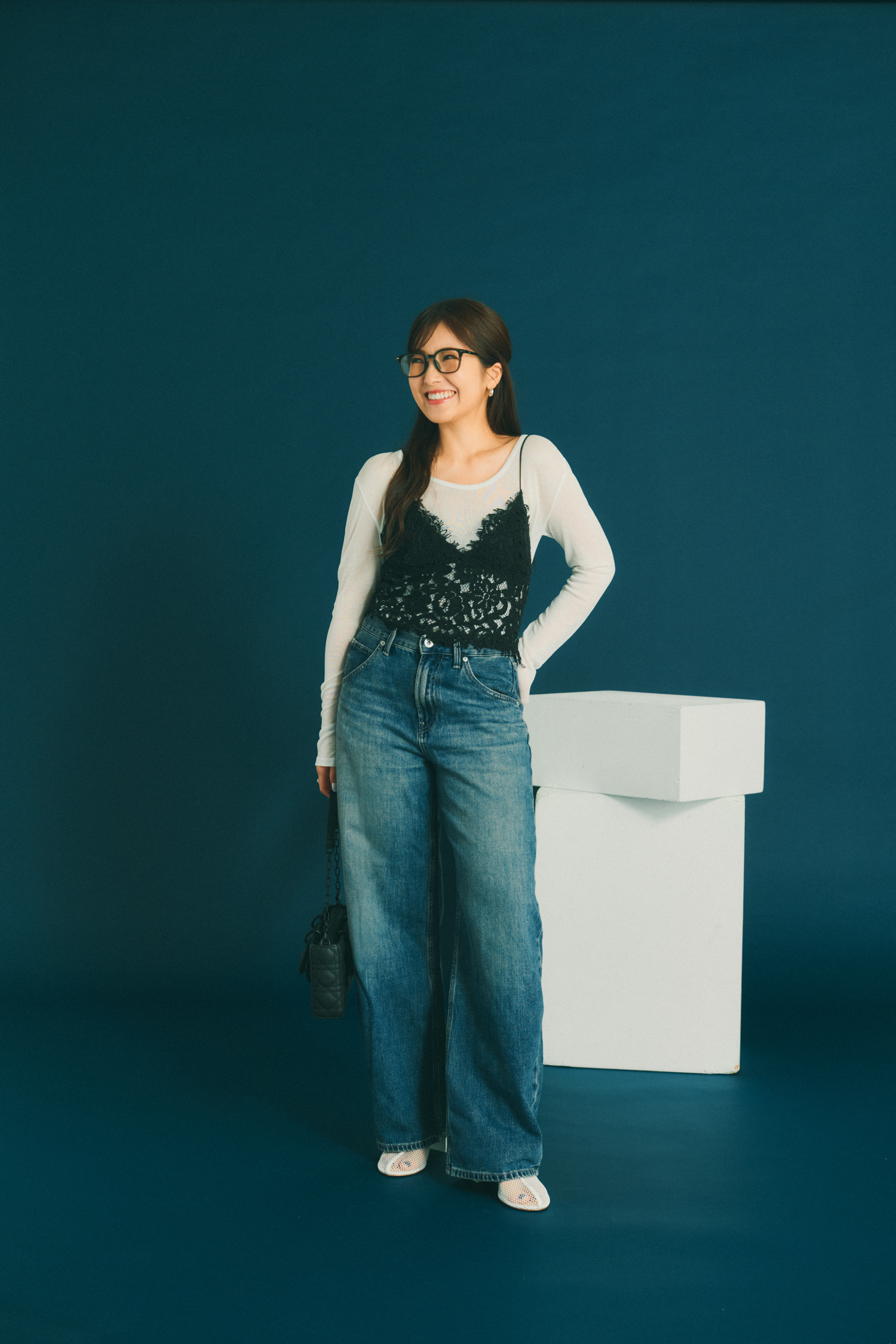 「今季の新作のユニクロのバギーカーブジーンズは、カーヴィ感が可愛くて購入しました。シルエットも素敵で、履いていくうちに生地がちょうどよく馴染んできた気がします。シンプルになりすぎないよう、トップスのレイヤードは女っぽさを意識。トリッシュのシアープルオーバーは透け感が絶妙で、ブラウンと2色買いするほど気に入っています」