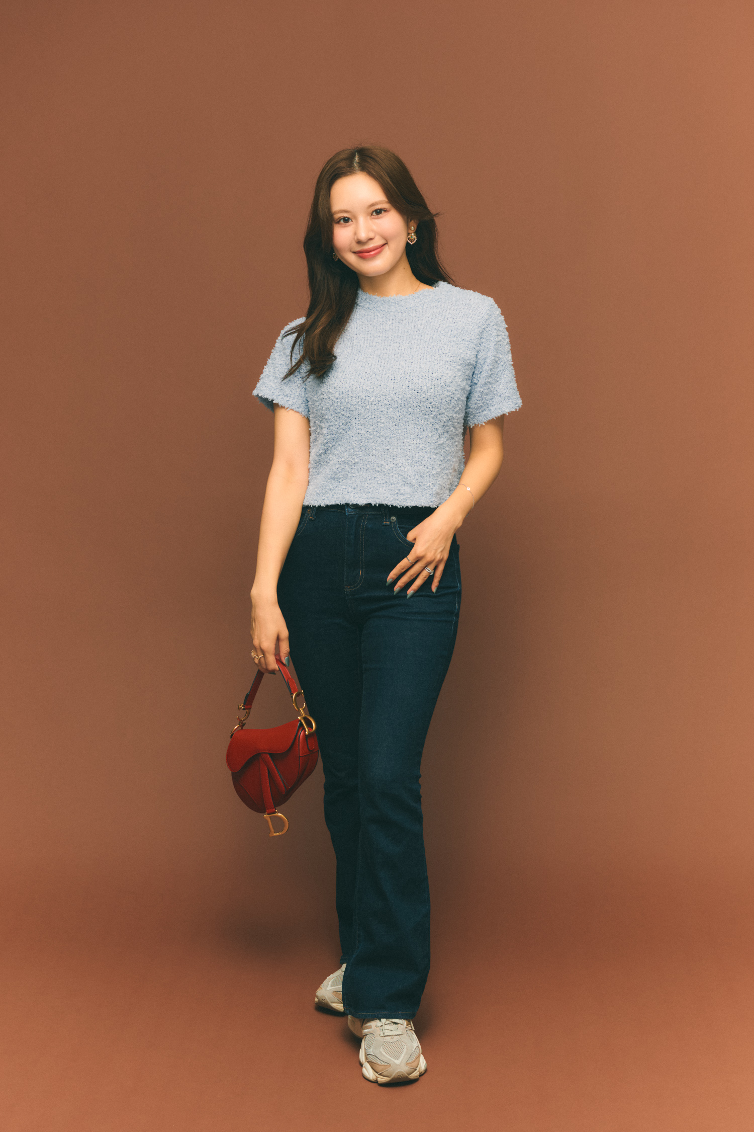 「最近、シンプルなワンツーコーデを海外のトレンド風に着こなすのにハマっています。濃いめのフレアデニムはGUで購入したもの。試着してみたら脚のラインをキレイに見せてくれて、使い勝手も抜群。履いていると“どこの?”と聞かれることも多いです。ディオールのバッグとニューバランスのスニーカーを合わせて、大人カジュアルに仕上げました。歩きやすいので、美術館巡りなどたくさん歩く日にもぴったり。先日根津美術館に出かけた時もこのコーデでした!」