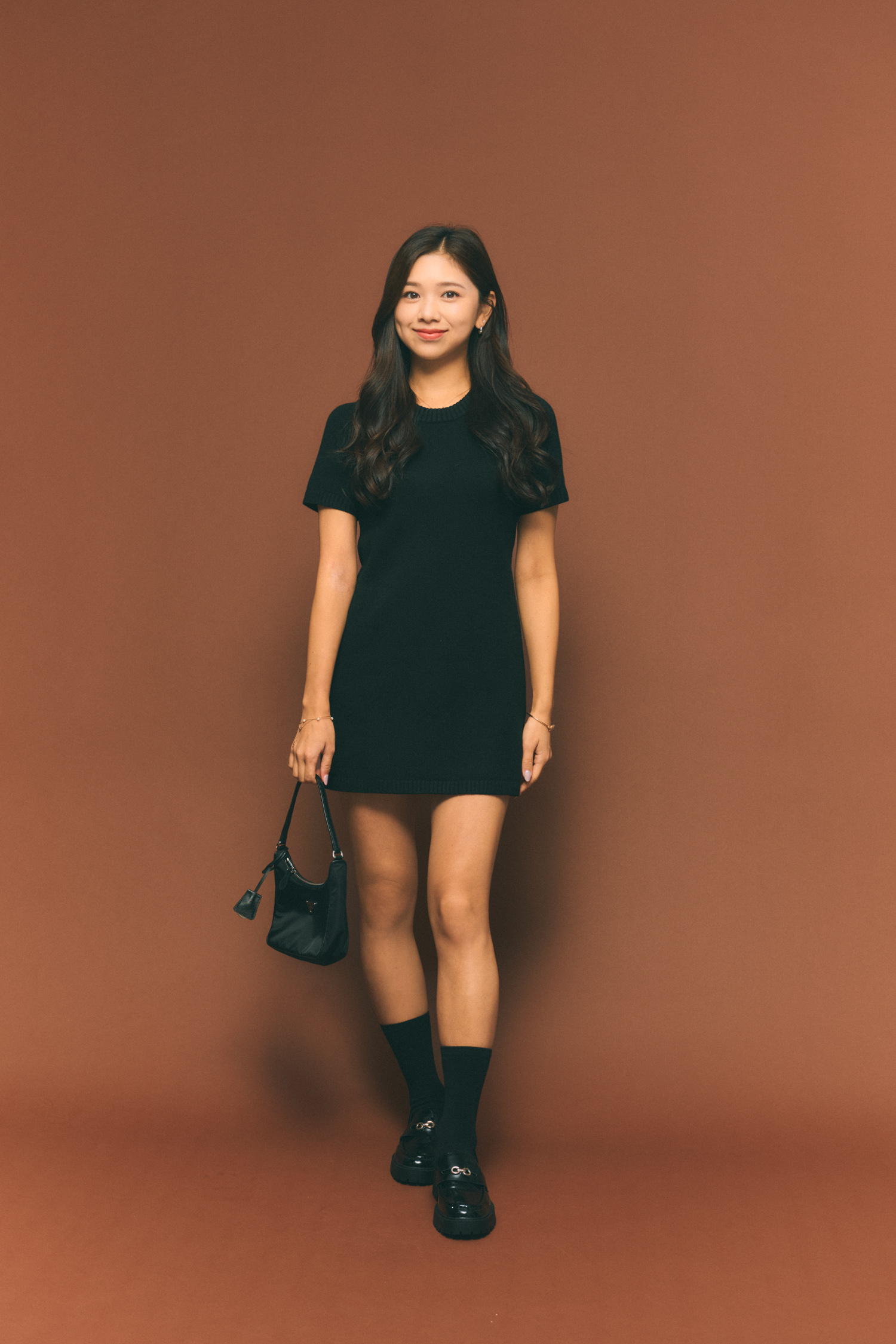 「H&Mで見つけた半袖ニットのワンピースは、1枚で着てもサマになるお気に入り。この時季はローファーを合わせてグッドガール風に。本格的な冬になったらロングブーツ×タイツの合わせを楽しみたいです。全体は黒でまとめることが多く、ミニ丈でも大人っぽく見えるのがポイント。足元はザラキッズで見つけたローファー。意外にもサイズがぴったりで可愛い掘り出し物でした。父からプレゼントでもらったプラダのバッグがシンプルな黒コーデを格上げしてくれます」