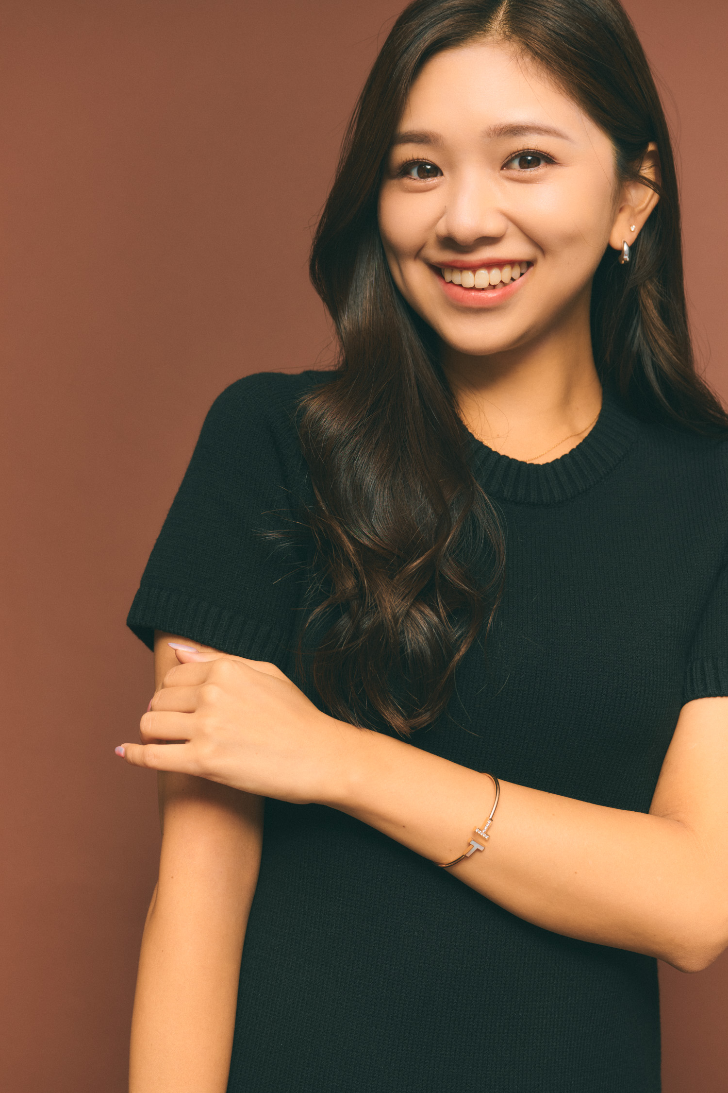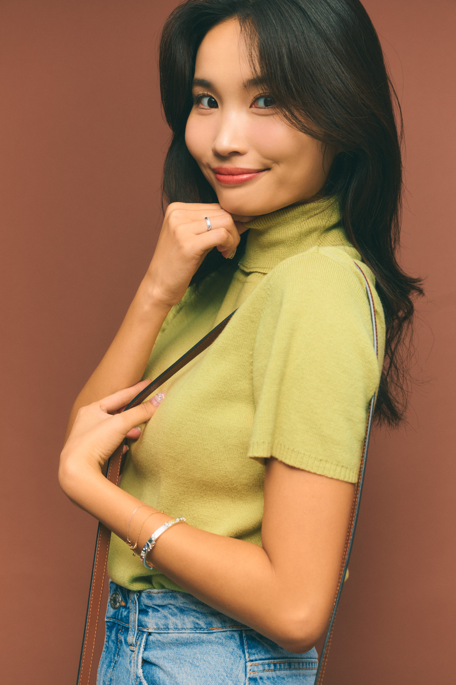 「この半袖ニットは母から2年前に譲り受けたタルボットのもの。グリーンっぽい色味のハイネックで、シンプルだからどんなコーデにも合わせやすくてお気に入りです。十分暖かいのに、薄手の生地感で重ね着しやすいのも嬉しいポイント」