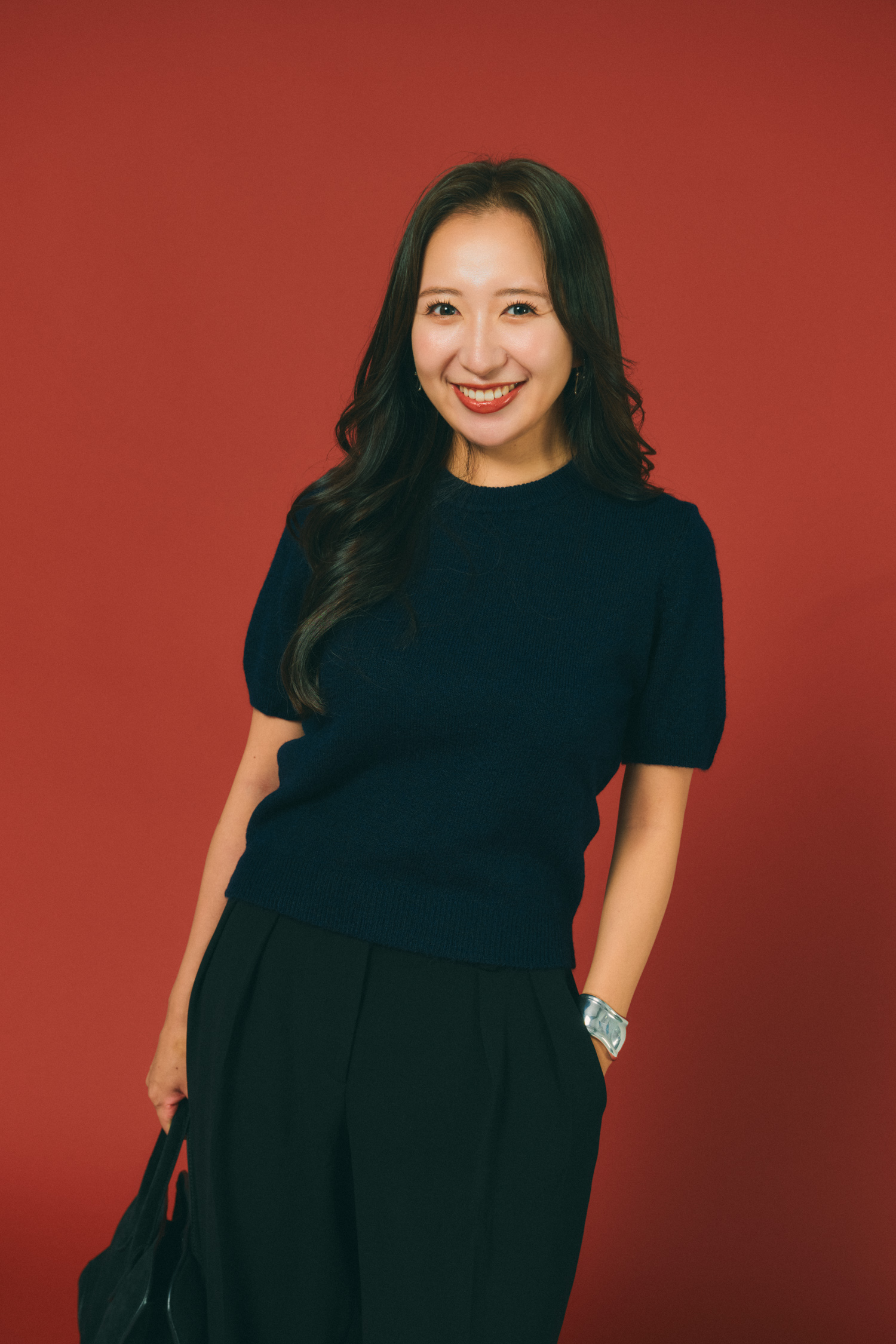 「ネイビーの半袖ニットにCOSのパンツを合わせて、足元はヒールで締めたオフィススタイル。半袖ニットはSサイズでも少しゆとりがあるので、あえてゆるめのボトムと合わせてメリハリがあるシルエットにしました。ジャケットを羽織ればクライアントとの打ち合わせにも行けるきちんと感がありつつ、シルバーのジュエリーでクールに。シンプルだけど、オンの日でも自分らしさを忘れないスタイルです」