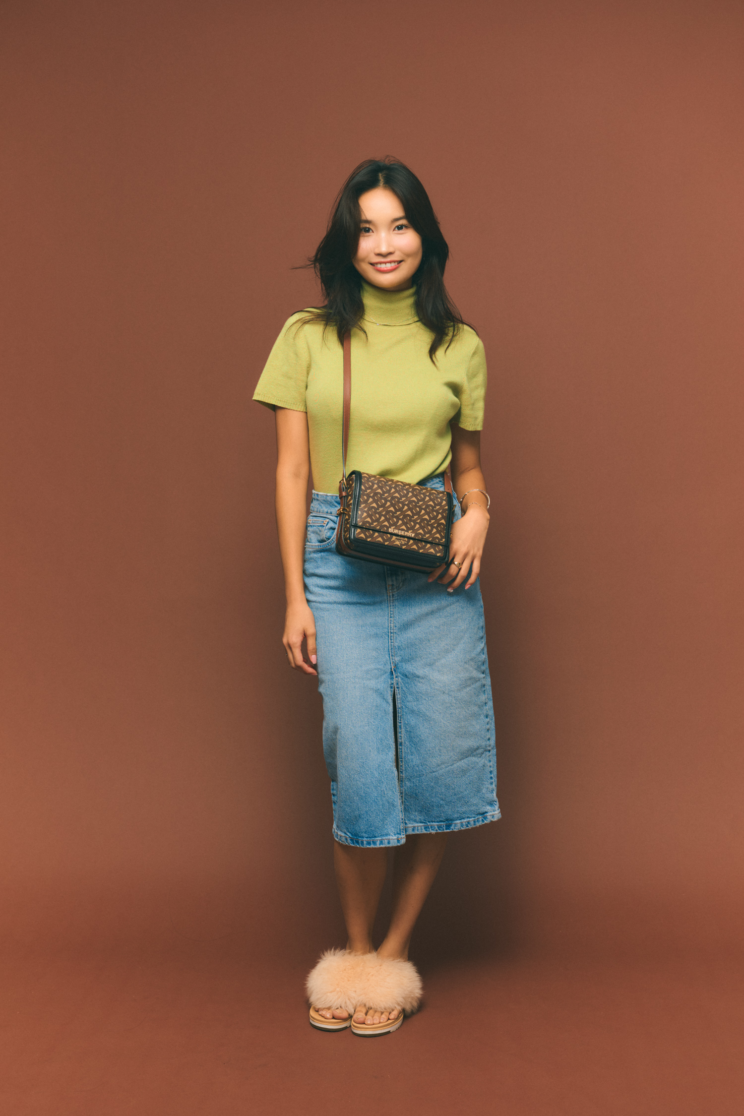 「グリーンイエローの半袖ニットを主役にした休日のカジュアルコーデ。今年の春に買ったザラのデニムスカートは膝下丈でスリット入り。歩いたときがかっこよくて、脚長効果もある気がします。外出時はジャケットを肩掛けしてきちんと感をプラス。小物はバーバリーのバッグでクラシカルに、足元はアグのファーサンダルで秋らしさを意識しました」