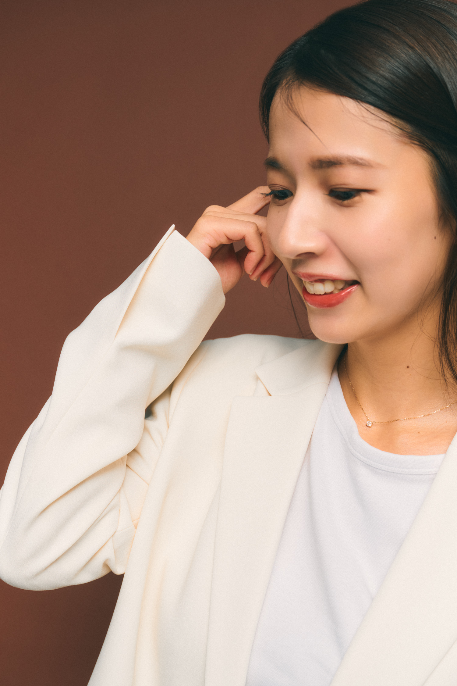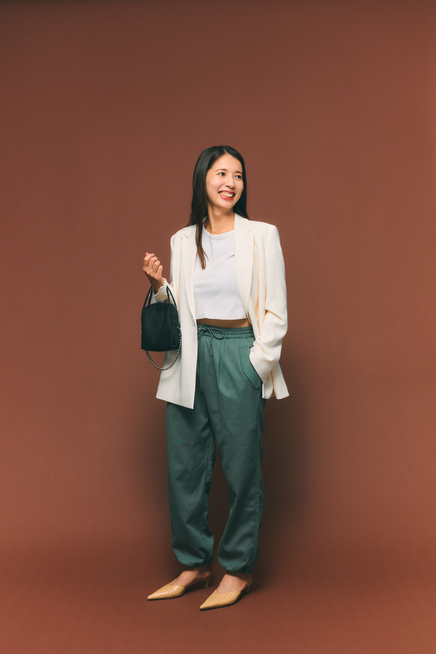 「白ジャケットって今まで持っていなかったのですが、セオリーで見つけたこの一枚はシルエットがとてもきれいで即決。顔まわりが明るく見えるし、ヒップまで隠れる長め丈だから実用性も抜群です。オンオフ問わずに使える万能な一枚です」