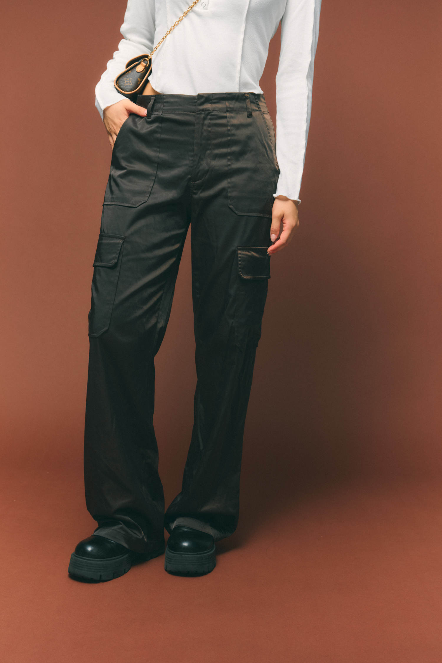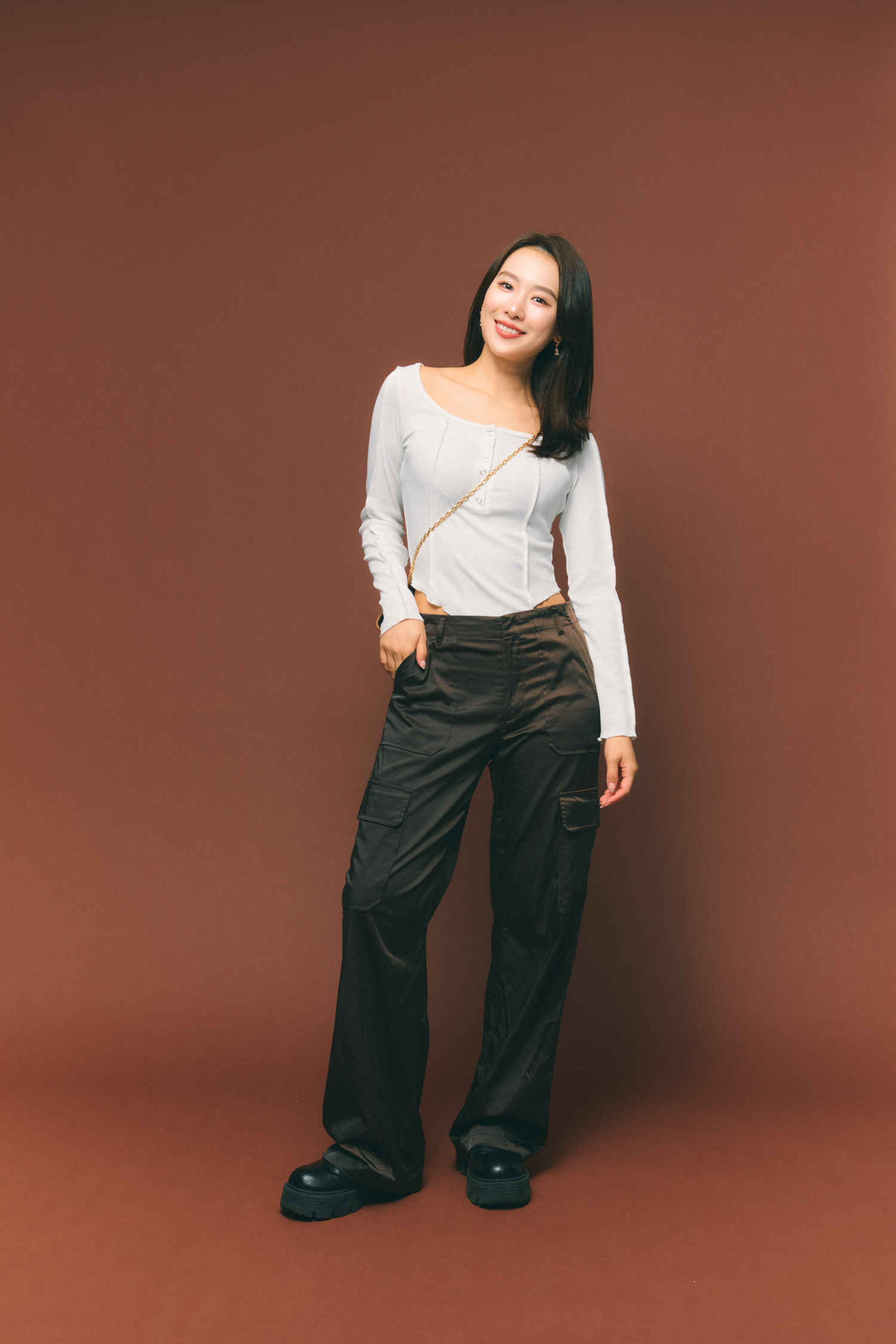 「サテンパンツはこの秋初めてトライ。スカートだと甘くなりすぎるけど、カーゴデザインなら程よくラフに穿けて、下着が響かないから後ろ姿を気にせずに使えます。ワイドすぎないシルエットでトップスを選ばず合わせやすく、これからの季節はボリュームニットと合わせても可愛いなと思っています」