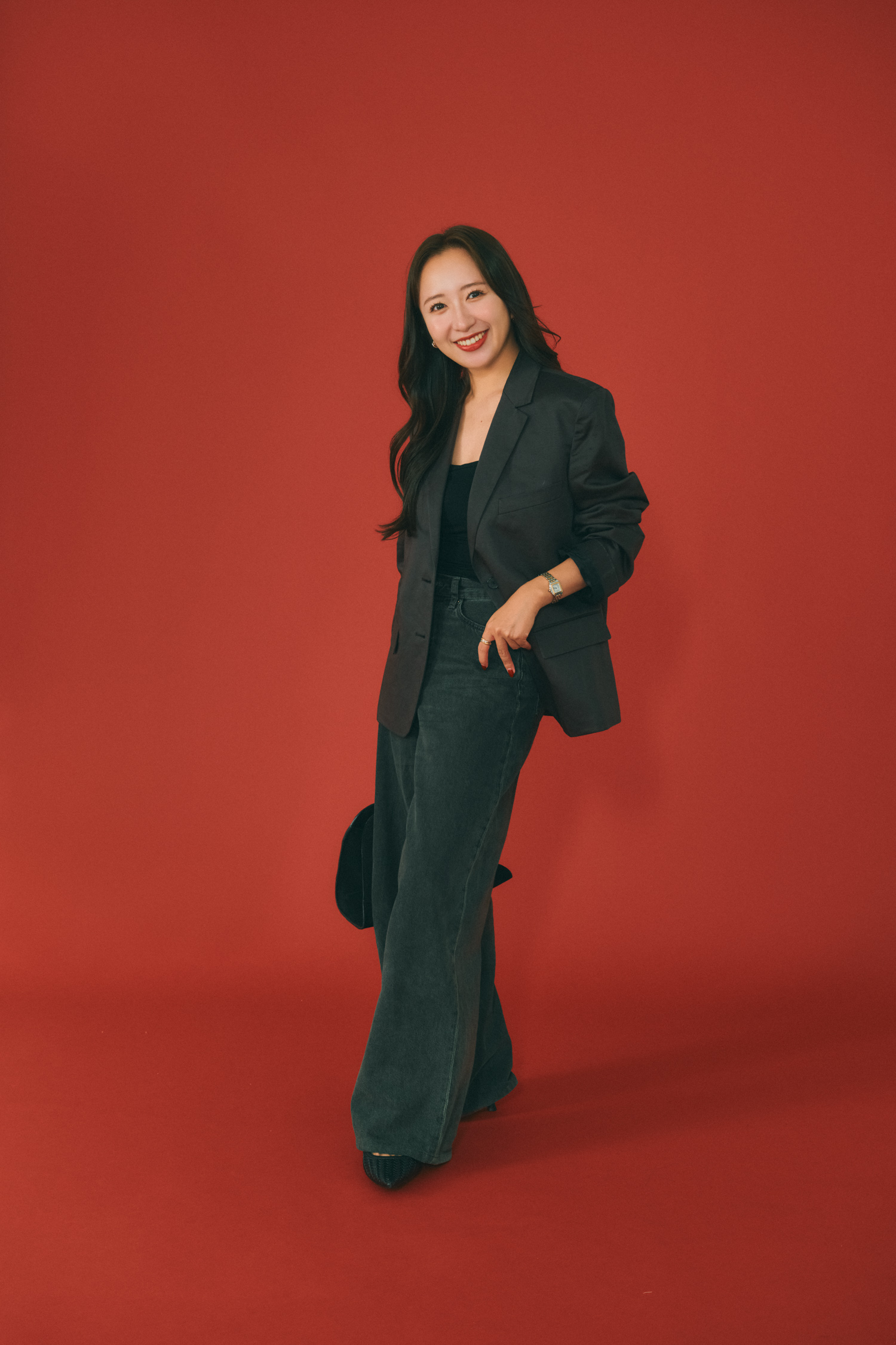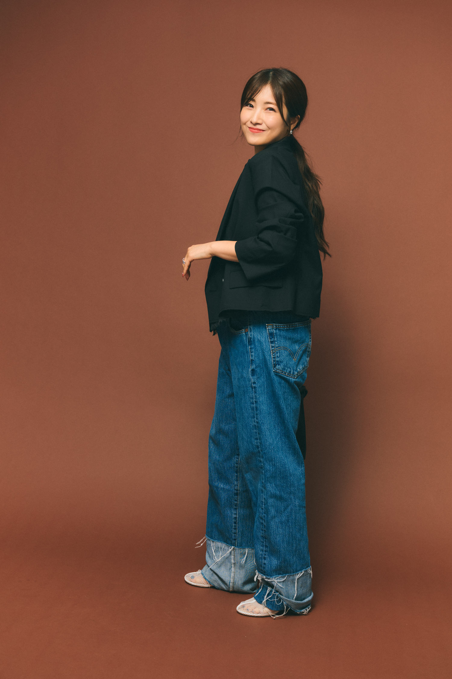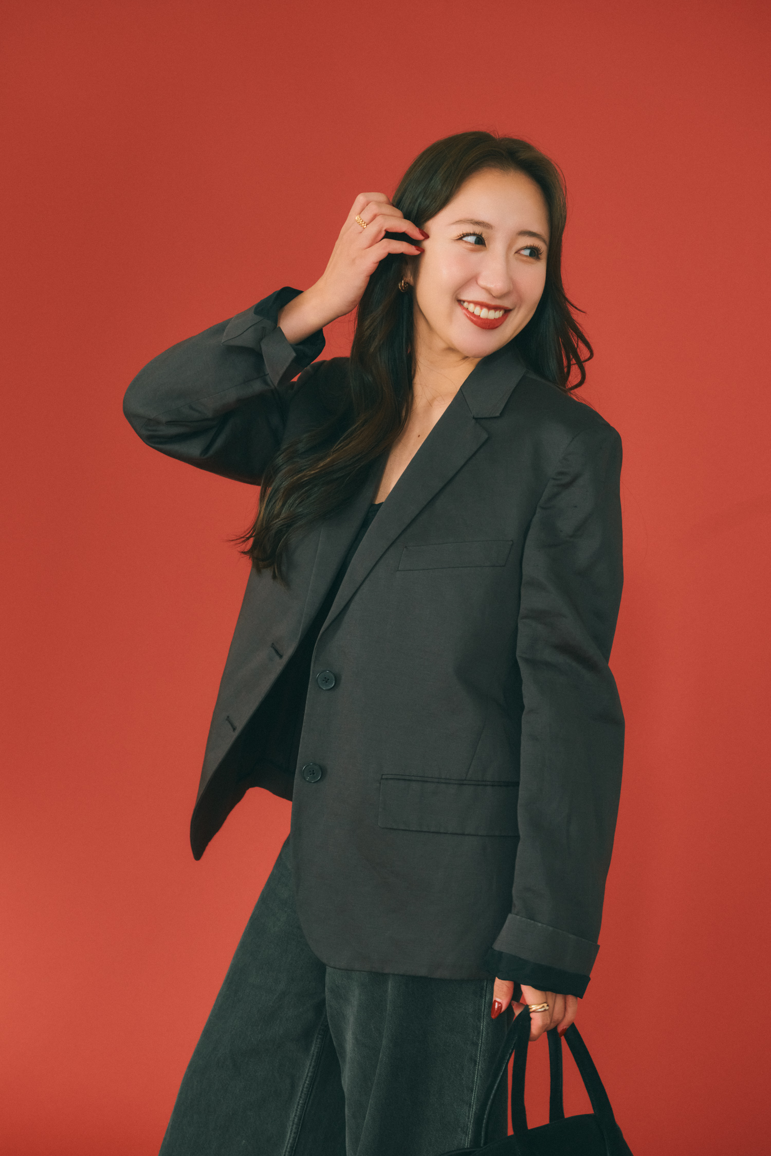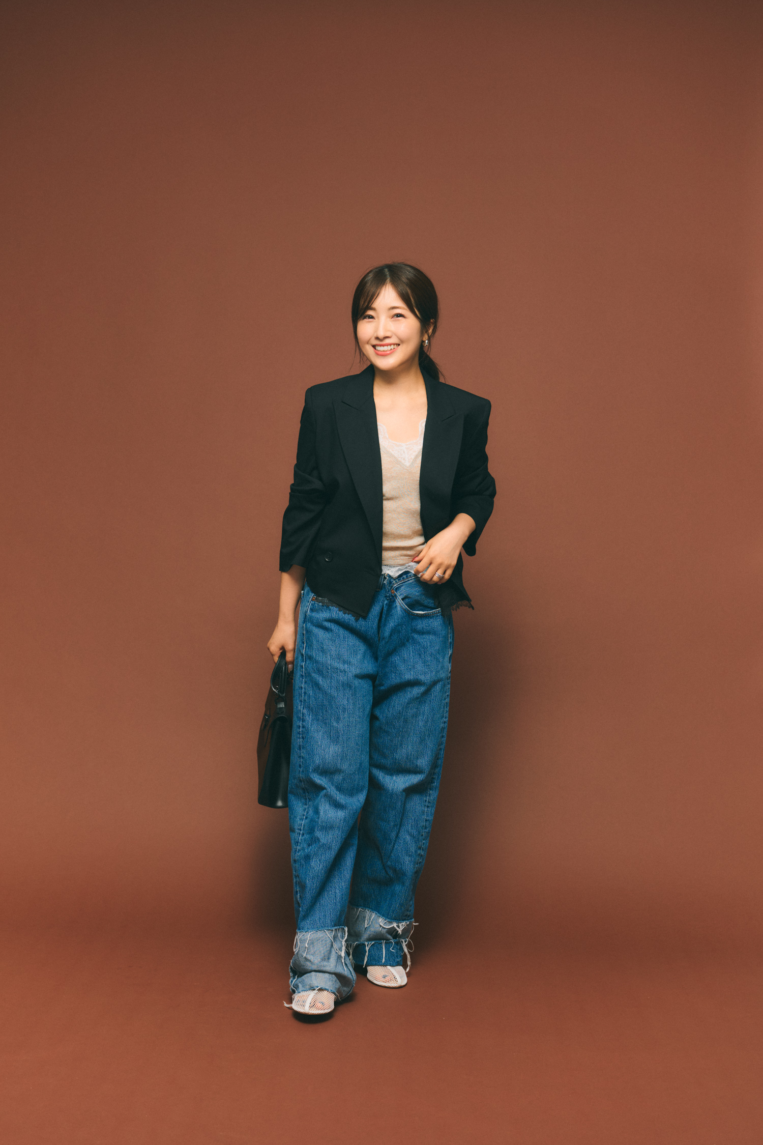 「遊び心のある短丈ジャケットは、デニムでカジュアルダウンすると一気に休日モードに。インナーはザラのキャミを合わせて、甘さをプラスしました。デニムは古着のリメイクで、1本ずつデザインが違うので3店舗回って見つけました(笑)。裾の切りっぱなしデザインが今っぽくて気に入っています。レザー風のPVCバッグは、雨の日も気にせず使えるのが便利。気温差のあるこの時期は、軽めのジャケットで調整するようにしています」