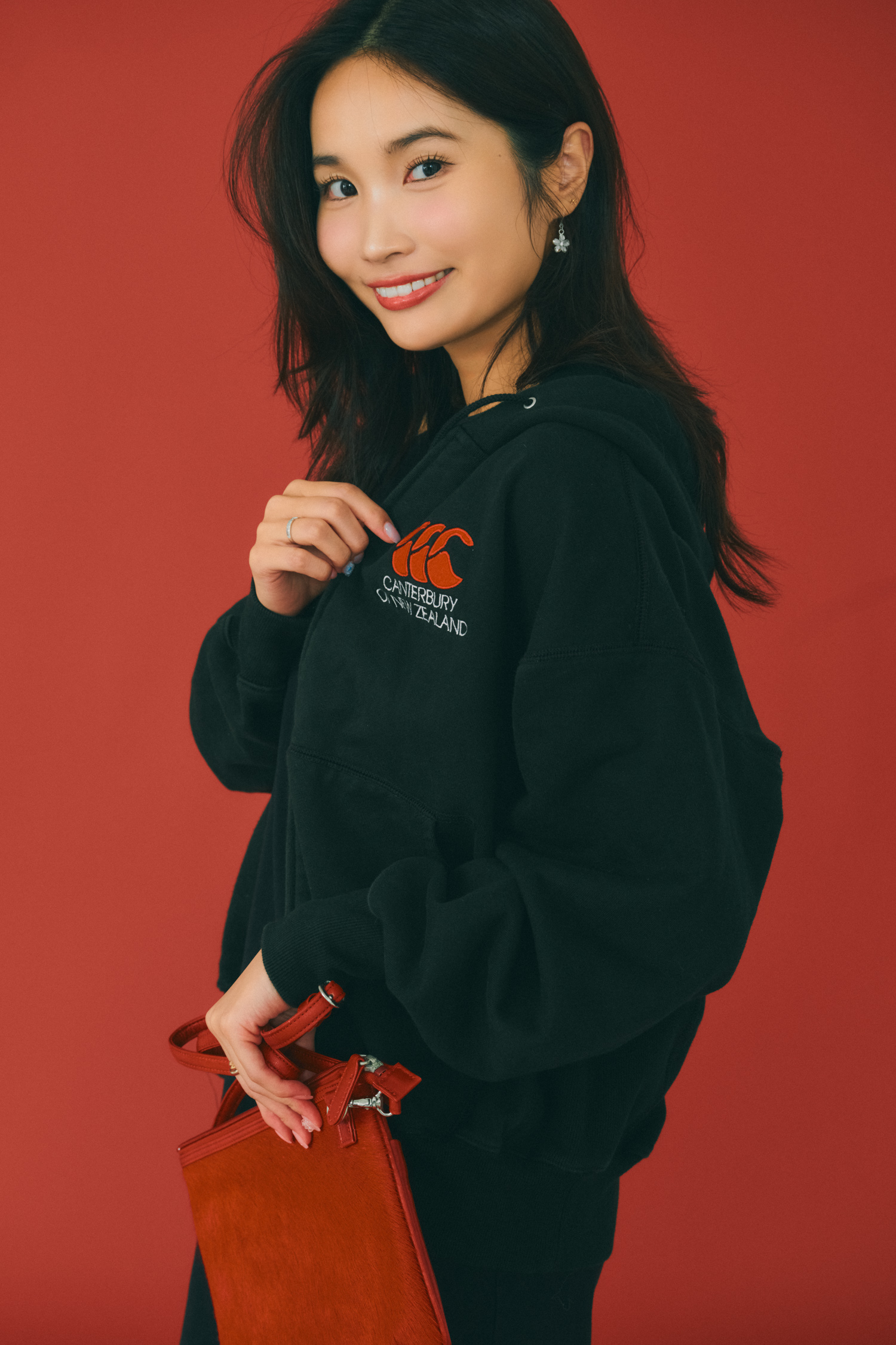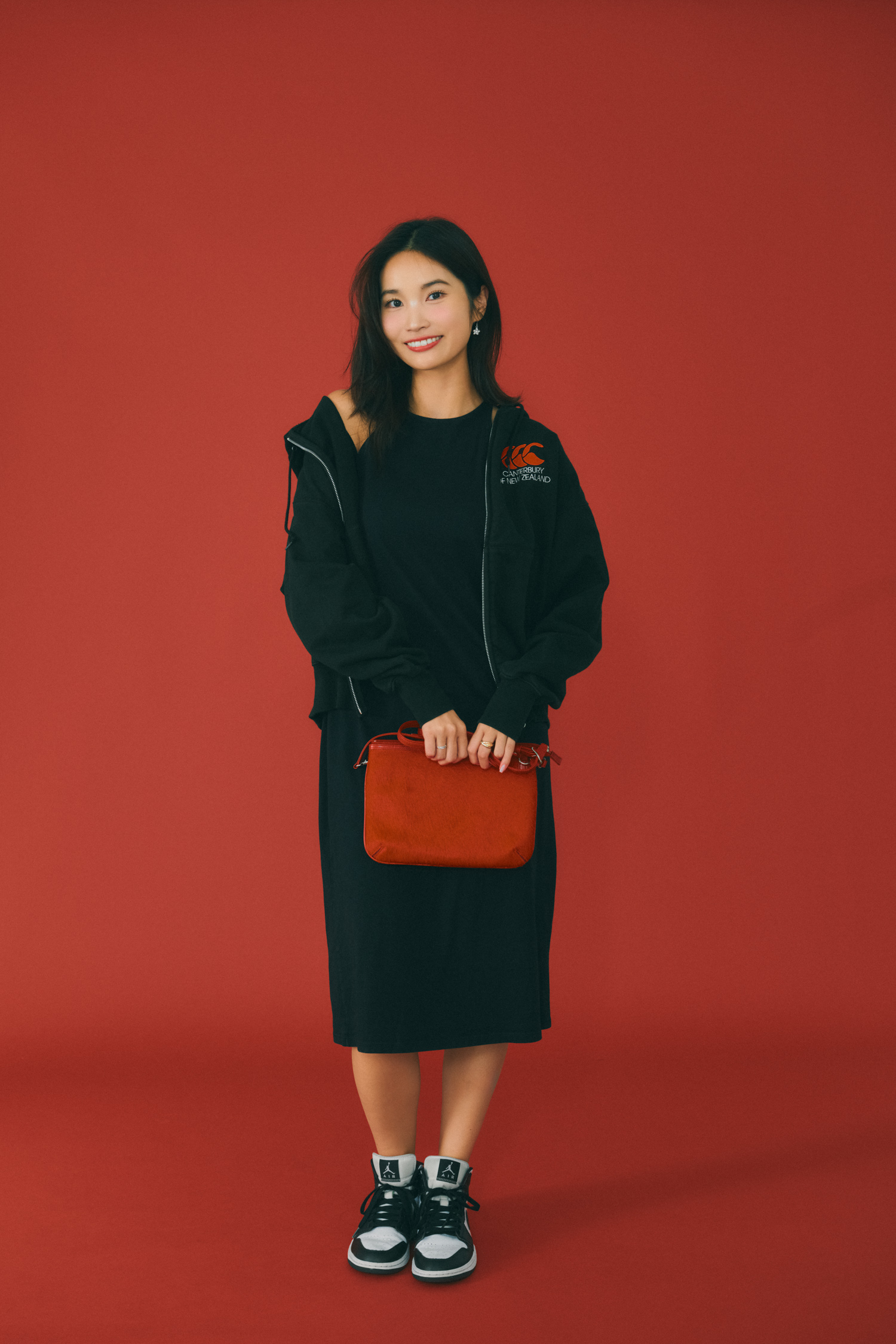 「春に購入したカンタベリーのブルゾンは、メンズだから彼ともシェアして使っています。オーバーサイズで腰まわりまでしっかりカバーしてくれます。軽くて持ち運びやすく、旅先や機内でもヘビロテ中。存在感のある赤ロゴがコーデのアクセントになってくれるので、バーニーズニューヨークの赤バッグとリンクさせました!」