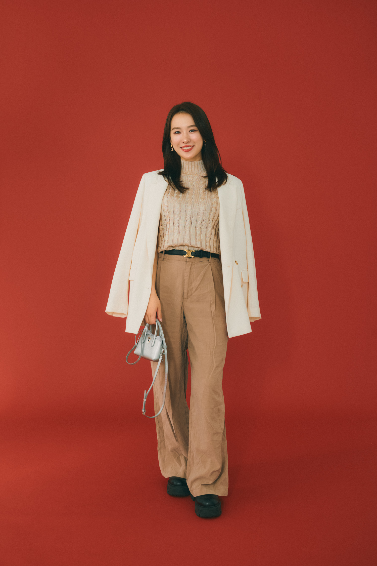 「昼夜の寒暖差があるこの時期は、羽織りで調整できるジャケットが活躍中。ザラの白ジャケットは、顔まわりがぱっと明るく見えるからつい手に取ってしまいます。リリーシルクのニットベストは素材が柔らかく、クリーミーなベージュの色味もお気に入り。ボトムスとブーツを黒にしてメリハリをつけました」