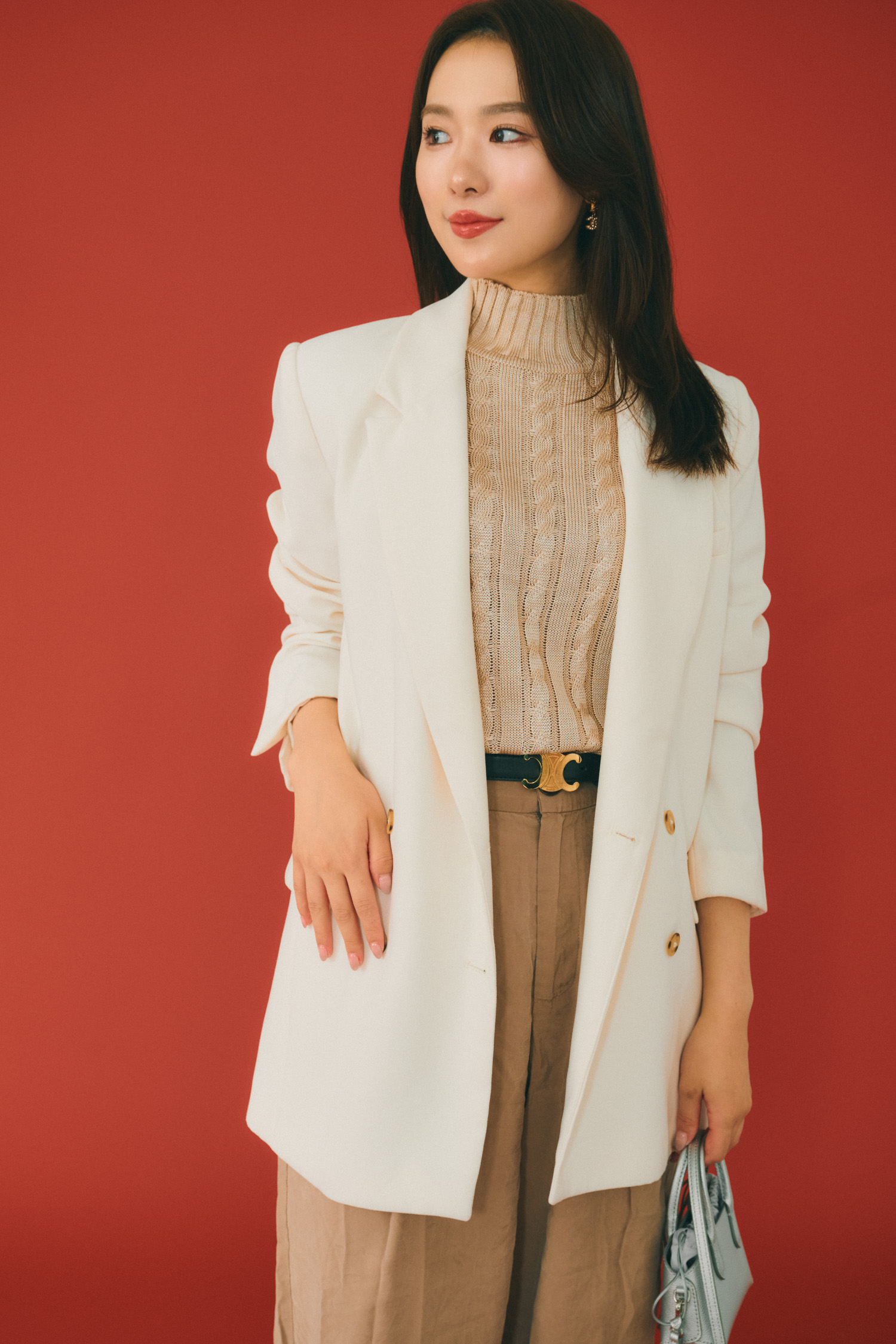 「きちんと感を出したい通勤の日に頼れるのが、ザラのダブルジャケット。肩パッド入りで小顔効果&長めの丈感でヒップまでカバーしてくれます。秋冬はどうしても色味が暗くなりがちだから、白を取り入れるだけで全体が軽やかに見えます」