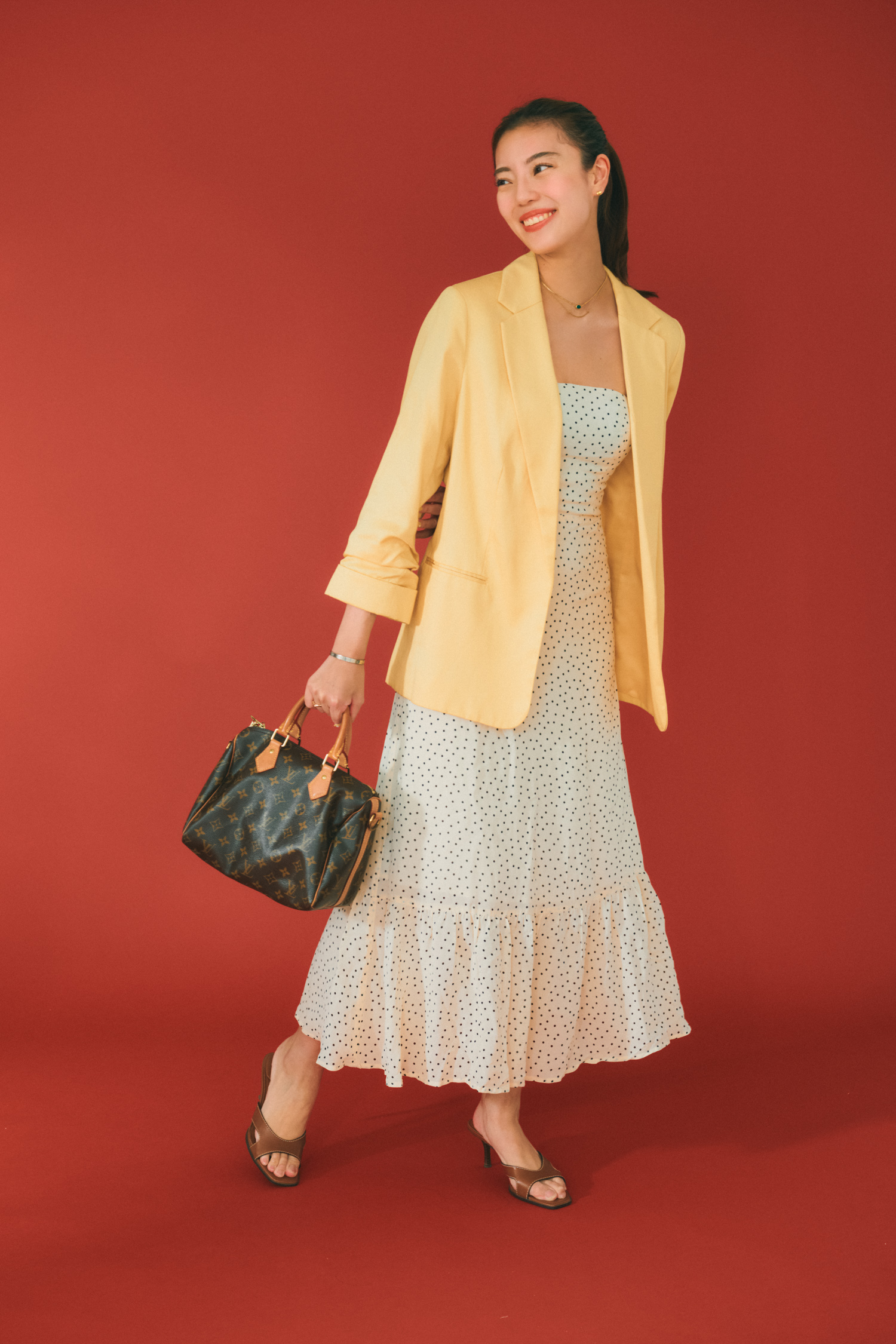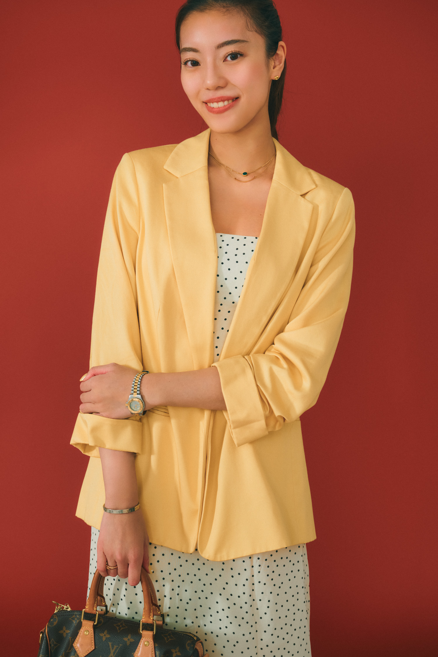 「普段はベーシックなスタイルが多いですが、今年は久しぶりにカラーを取り入れたくて、バナナ・リパブリックのジャケットを主役に。パキッとしたイエローで存在感がある分、他はシンプルにまとめるようにしました。リフォーメーションのドットワンピは去年の誕生日ディナー用に買ったお気に入り。甘すぎないドット柄と落ち感のあるシルエットで、旅先では一枚で着ることも。ちょっとしたお出かけや夜ごはんの日にぴったりのコーデです」