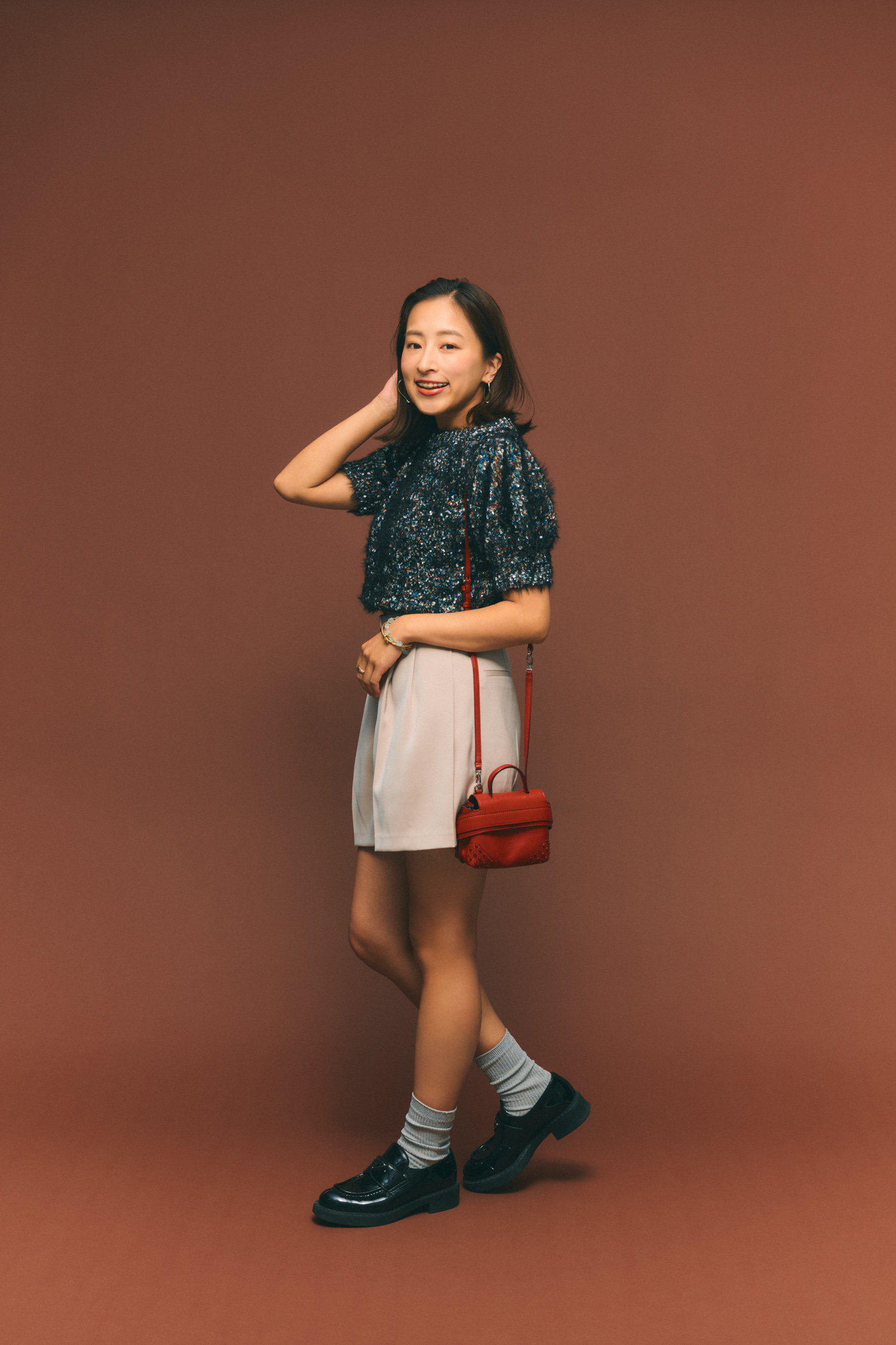 「おでかけの日は、ミニ丈を大人っぽく取り入れるのが気分。フレイ アイディーのショートボトムスは丈のバランスが絶妙で、ローファー×ソックス合わせにすると程よくクラシックにまとまります。服はベーシックカラーで統一しつつ、バッグで抜け感をプラス。真冬はロングブーツを合わせても可愛い!」