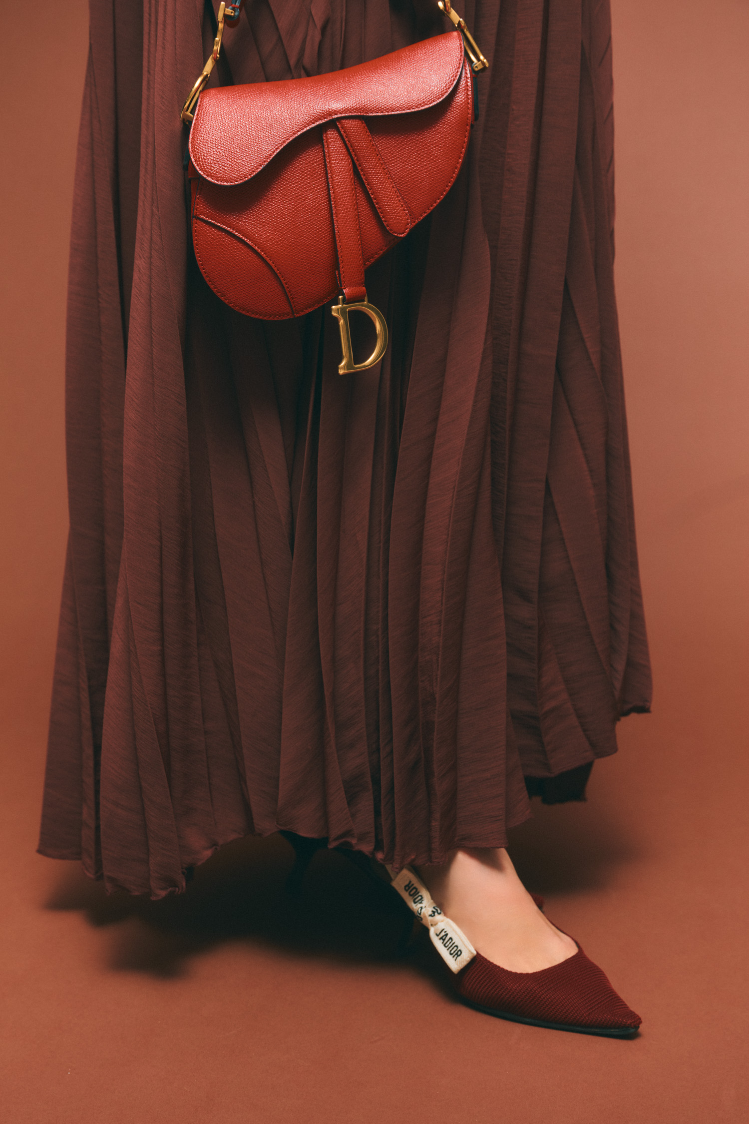 「ディオールのサドルバッグは思っていたよりも実物の赤が深くて、一目惚れでした。定番モデルだけど、他人と被らない珍しい色味がポイント。ヒールは誕生日にプレゼントでもらったもので、どちらも大切に愛用しています」