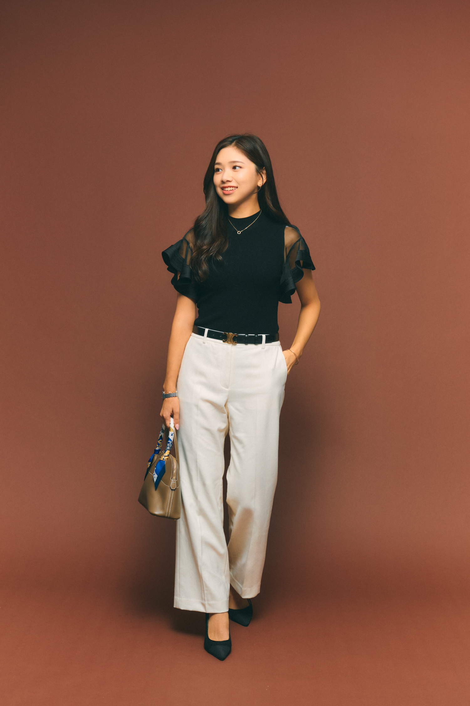 「オフィスワークの日はモノトーンでまとめることが多いので、ジュエリーで華やかさを足すようにしています。フレイ アイディーのトップスは袖のシアーフリルが上品で1枚で着映えます。ジャケットを羽織ればクライアント対応にも◎。お気に入りのジュエリーを身につけていると、目に入るたびに気分が上がります」