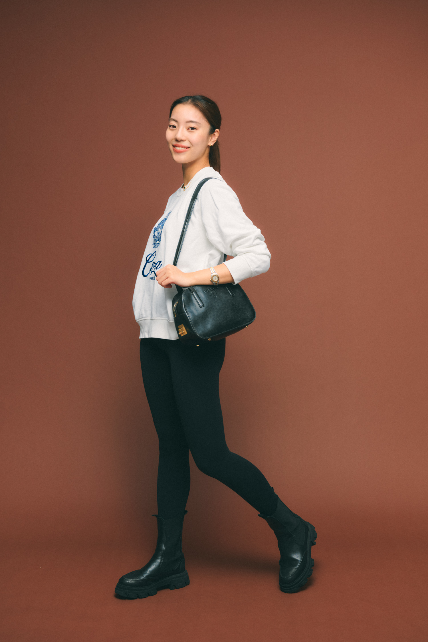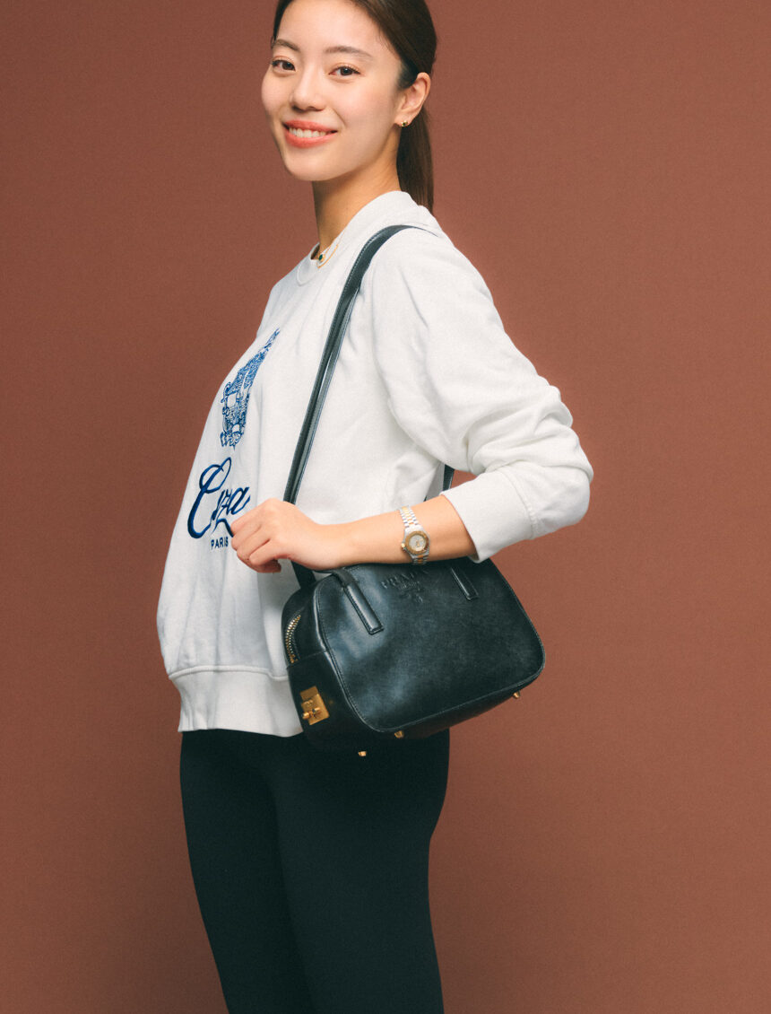 「7年ほど前に叔母からもらったプラダのバッグは、今でも大切に愛用しているお気に入りです。スポーティな服が多いけど、このバッグを合わせるだけでコーデがぐっと大人っぽく見えます。ゴールドのジップがアクセントになって、どんな日も気分を上げてくれます」