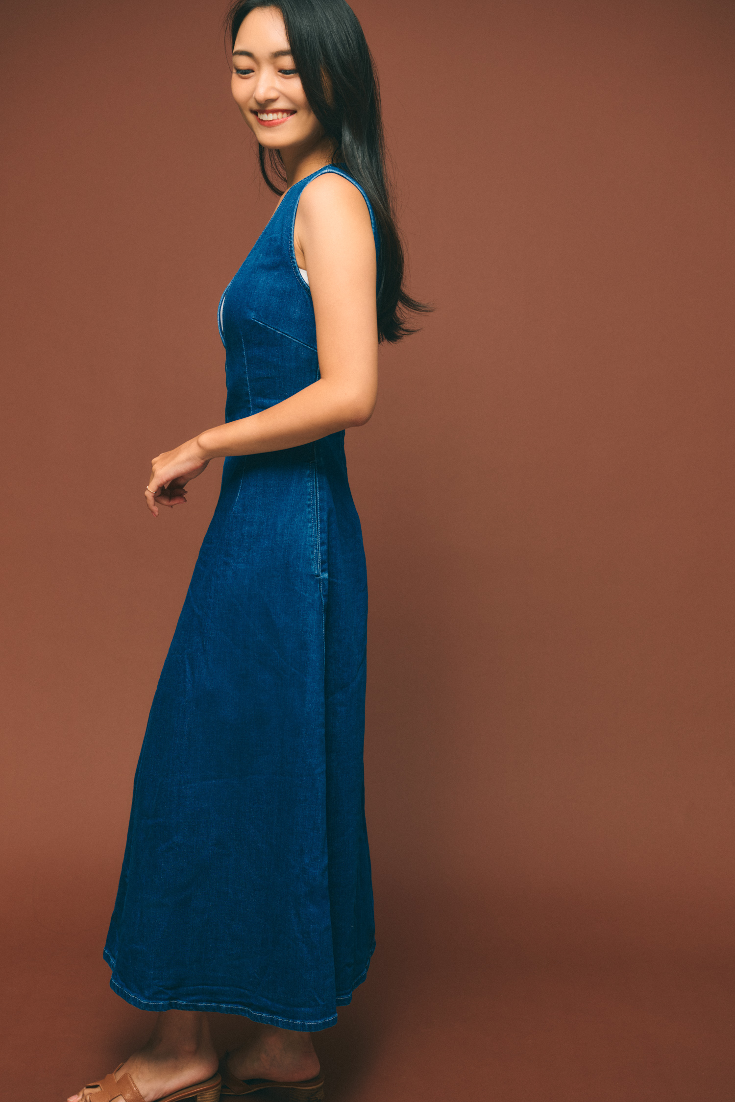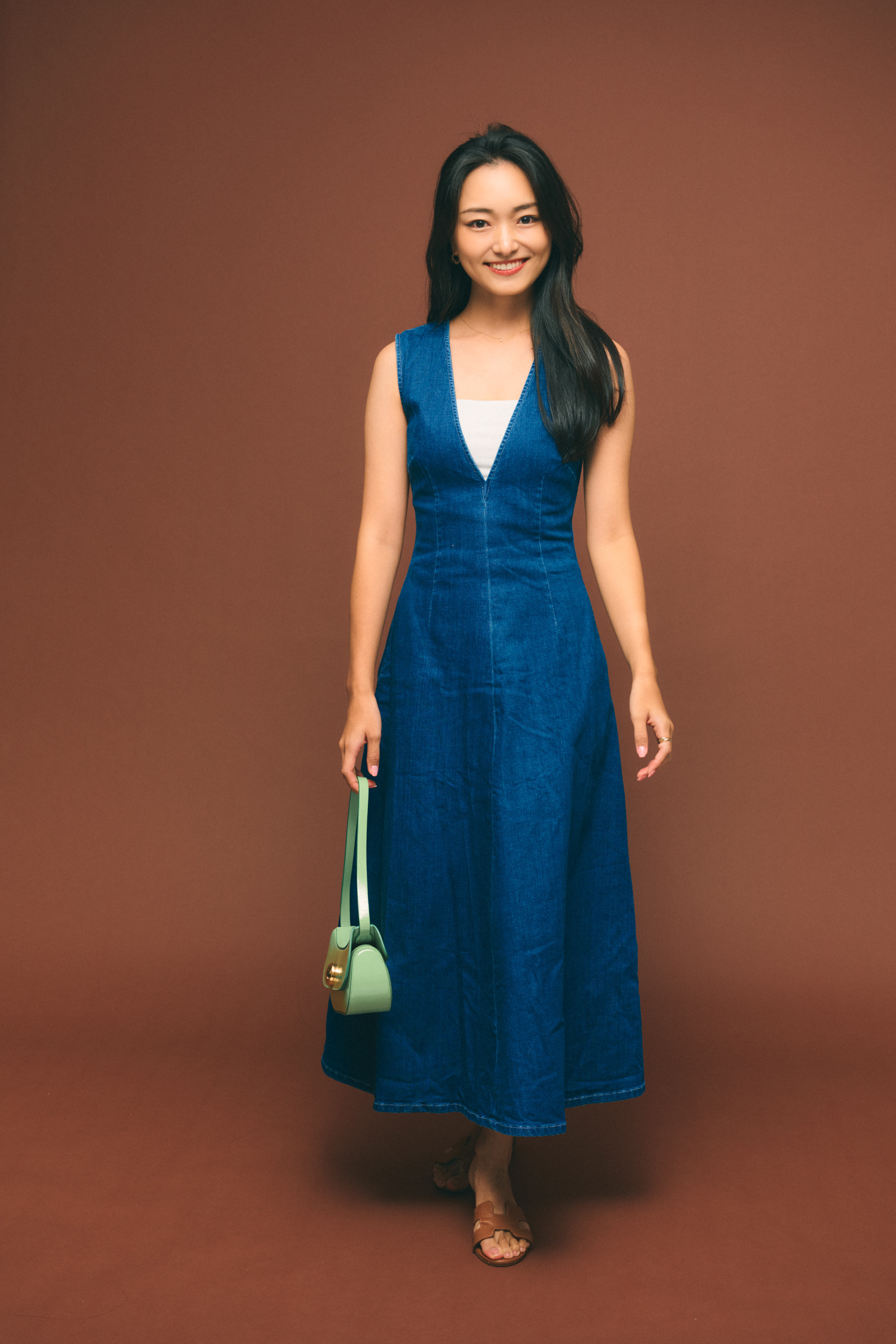 「ステラ マッカートニーのデニムワンピースは、通年で着られる万能アイテム。ほどよい厚みのある生地でラインがキレイに出て、広がりすぎないスカートシルエットも絶妙。ウエストが自然にくびれて見えるデザインだから、カジュアルでも大人っぽく着こなせます」