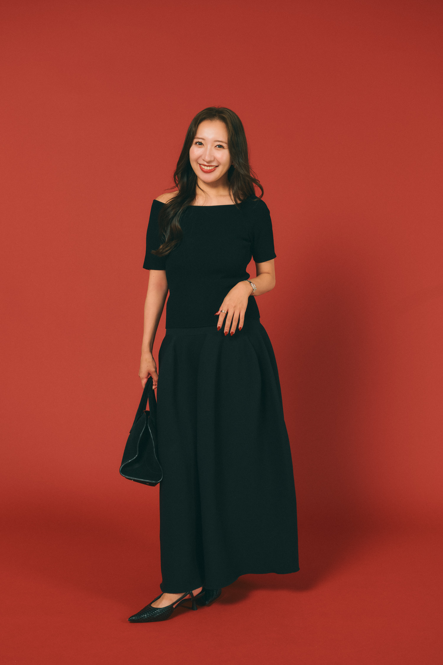 「一見ワンピース風ですが、実は黒トップスと黒スカートの組み合わせです。ナイスナイスモーメントのオフショルダーニットはカップ付きで、下着を気にせず1枚で着られるのが便利。CFCLのボリュームスカートを合わせて、オールブラックでも立体感のある着こなしにしました。前職の最終出社日は、 キレイめレストランでランチの予定があったので、きちんと見えと洒落感のバランスが取れるこのコーデで出社しました」